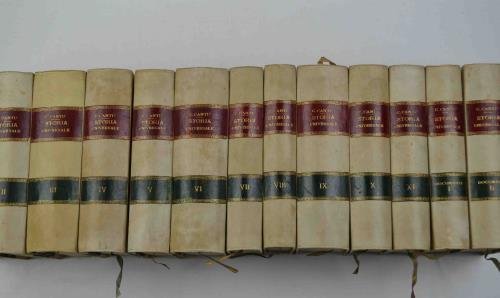 Ventidue volumi di cm. 17,5, pp. 15.000 ca. complessive. Solida ed elegante legatura del tempo in mezza pergamena, dorsi lisci con titoli in oro su doppi tasseli bicolore. Ottimo stato di conservazione. Dodici volumi compongono il corpus principale dell'opera, mentre i successivi 9 (suddivisi in molte parti) contengono i documenti, le biografie, ecc. e infine l'ultimo è interamente composto dagli indici dell'opera.