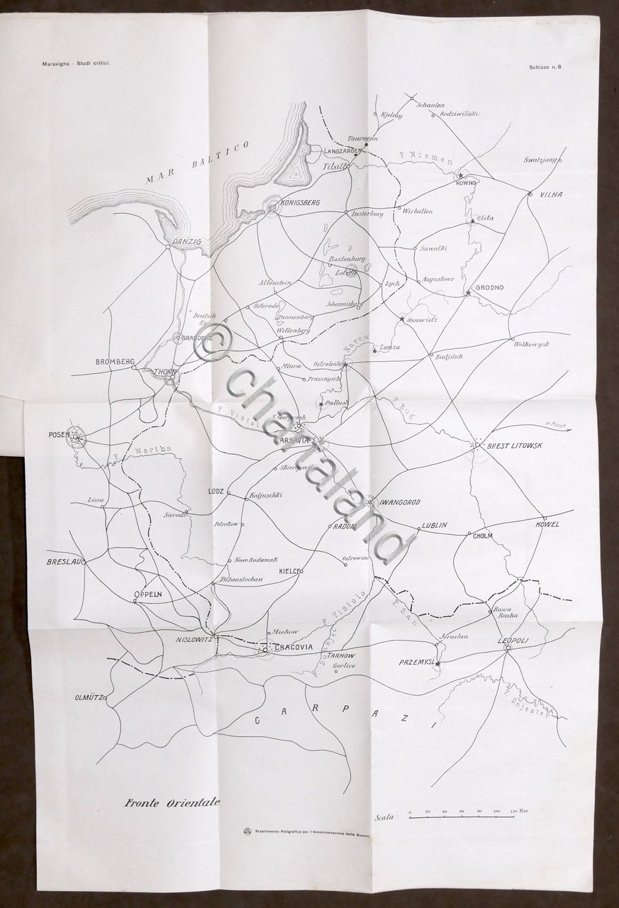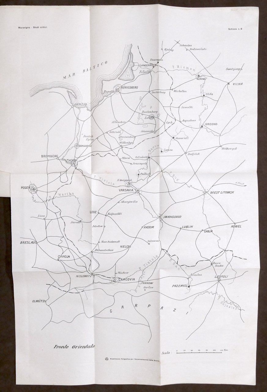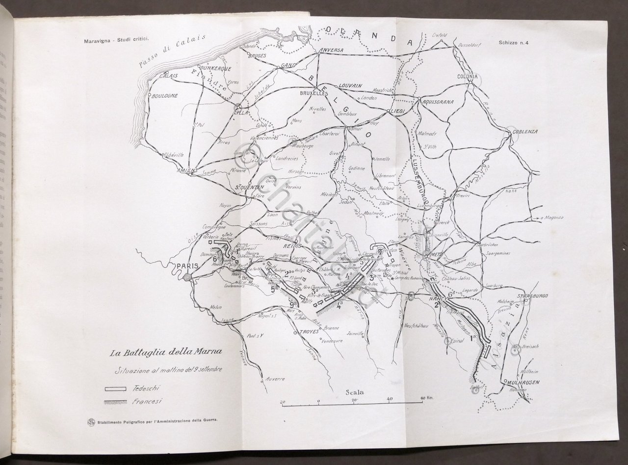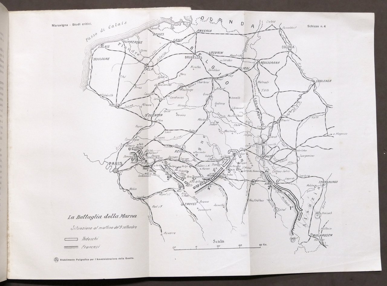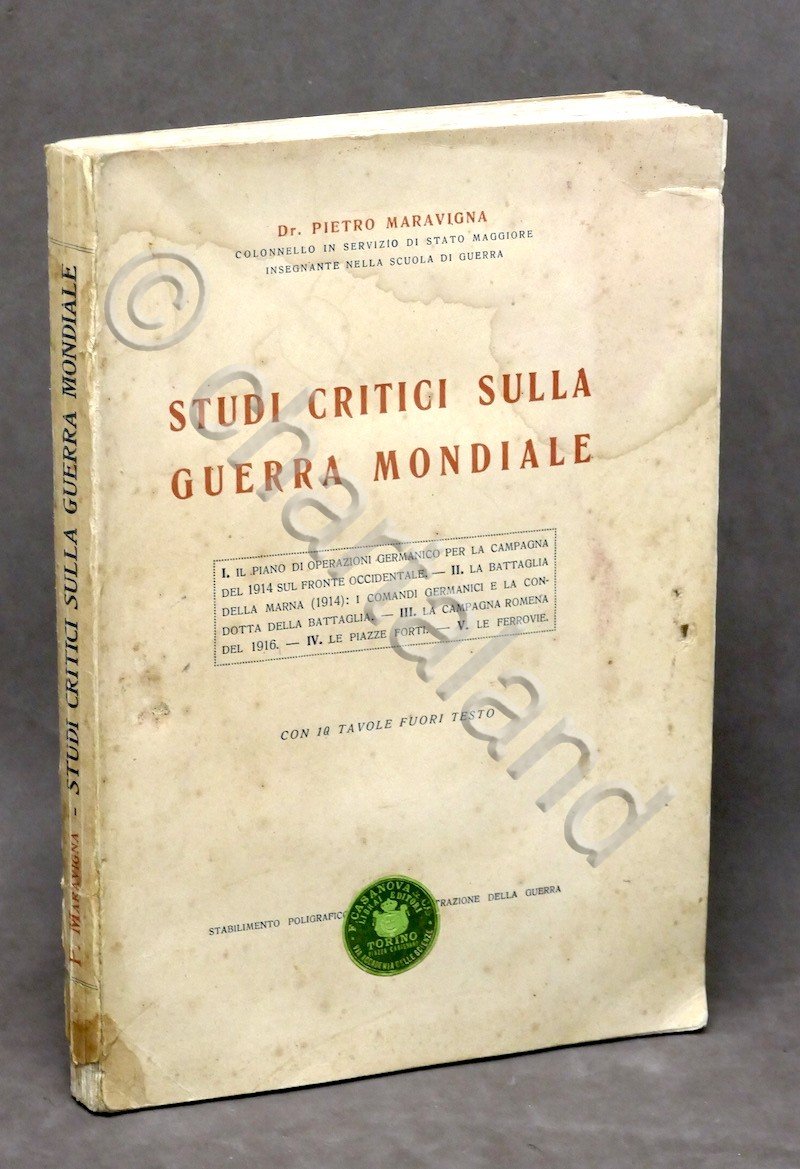 Storia WWI Pietro Maravigna Studi Critici sulla Guerra Mondiale Roma, Stabilimento Poligrafico per l’Amministrazione della Guerra Editore, 1^ ed. 1922 1, Il piano di operazioni germanico per la campagna del 1914 sul Fronte Occidentale; 2, La Battaglia della Marna (1914): i comandi germanici e la condotta della battaglia; 3, La campagna romena del 1916; 4, Le piazze forti; 5, Le ferrovie Pag. VII, 320. Con 10 tavole fuori testo. Testo in italiano. Copertina morbida. Buone condizioni. Piccola mancanza al dorso. Leggere tracce di umidità alle copertine.