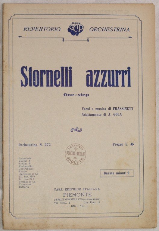 In 8. cm 27x18,5. Pp. 16. partitura completa per orchestra del 1929 di una canzone. Caratteristica copertina illustrata d'epoca. Ex libris sulla copertina. In ottime condizioni. a complete score for orchestra of 1929. Carachteristic decorated cover of that period. Ex libris in the cover. In very good conditions.