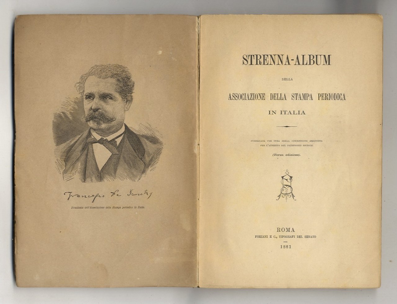 Roma, Forzani e C., 1881, in-8, br. editoriale con la copertina anteriore figurata in litografia, pp. 343, [1]. Con un ritratto in antiporta, un calendario in litografia e decine di tavole in litografia anche di musica notata, alcune delle quali ripiegate. Con scritti di G. Prati, G. Costetti, S. Pellico, C. Boito, C. Collodi (Ricordi dal vero), V. Imbriani, G. Rossetti, e molti altri. Mancanza di circa 10 cm al dorso reintegrata.