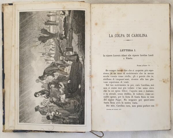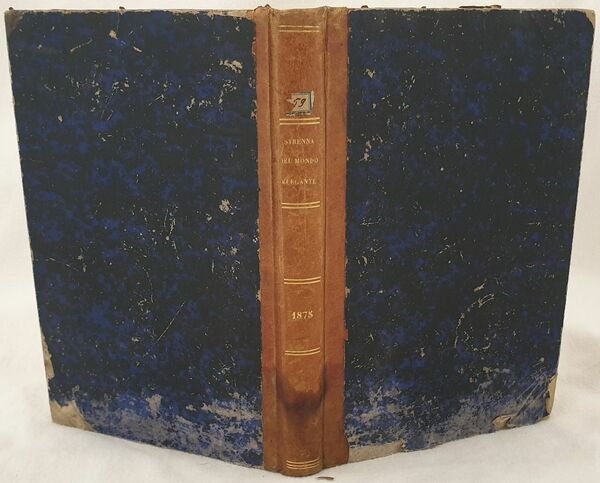 Strenna del periodico "Il Mondo Elegante compilata da sole donne" per l'anno 1875. All'interno testi sonetti e brani scritti dalle lettrici. Tre incisioni litografiche impreziosiscono il testo. Tra i brani presenti: La colpa di Carolina di Luisa Saredo, Un matrimonio ai di nostri, Detti e arguzie greche di Rosa Mezzanotte, La leggenda del Frankenburgo di Carlotta Swift, Il segreto della viola di Giuseppina Ferraris Mirolio di Moncestino, La campanula di Gemma Giovannini, Pensieri di Berenice Leosini Alferi Osorio, Una madre sulla tomba della sua bambina di Pezzi MArgherita, Pel giorno natalizio di Lucia Spada ecc. Alla fine spartito "Vogleins Frage" di C. E. Pax. In buone condizioni. Copertina in mezza pelle con titolo e decorazioni in oro al dorso in buone condizioni generali con lievi usure marginali. Legatura in buone condizioni. Pagine in buone condizioni con fioriture. In 8. cm 23,5x16. Pp. (6)+208Strenna of the magazine "Il Mondo Elegante compilata da sole donne" for the year 1875. Inside texts sonnets and writings from female readers. Three plates enrich the text. The texts inside: La colpa di Carolina di Luisa Saredo, Un matrimonio ai di nostri, Detti e arguzie greche di Rosa Mezzanotte, La leggenda del Frankenburgo di Carlotta Swift, Il segreto della viola di Giuseppina Ferraris Mirolio di Moncestino, La campanula di Gemma Giovannini, Pensieri di Berenice Leosini Alferi Osorio, Una madre sulla tomba della sua bambina di Pezzi MArgherita, Pel giorno natalizio di Lucia Spada ecc. Alla fine spartito "Vogleins Frage" di C. E. Pax. In good conditions. Half leather coeval cover with gilted title and decorations in the spine in good conditions lightly worn in the extremities. Binding in good conditions. Pages in good conditions with foxing. In 8. cm 23,5x16. Pp. (6)+208