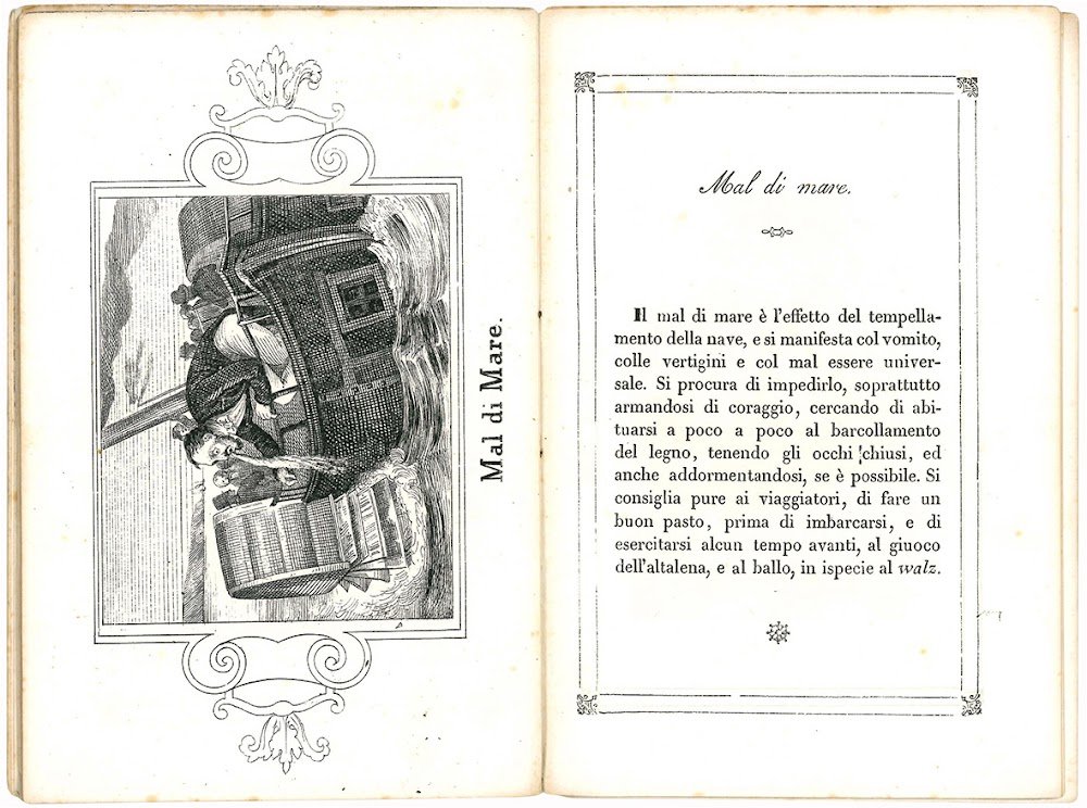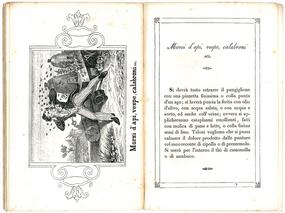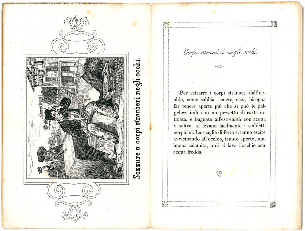 Interessante strenna medica impressa intorno al 1840 nella qualle sono presentati l'asfissia o morti apparenti; gli avvelenamenti; i calli, i porri e i bitorzoli; i colpi alla testa e le cadute; i corpi estranei negli occhi; le distorsioni e le ammaccature, le dita schiacciate; le emorragie nasali; i geloni; la gotta; l'idrofobia; l'indigestione; il mal di denti; il mal di mare; il mal d'occhi; i morsi di api, vespe e calabroni; le punture di aghi e spille; la rogna; le scottature; i tagli e le scorticature...