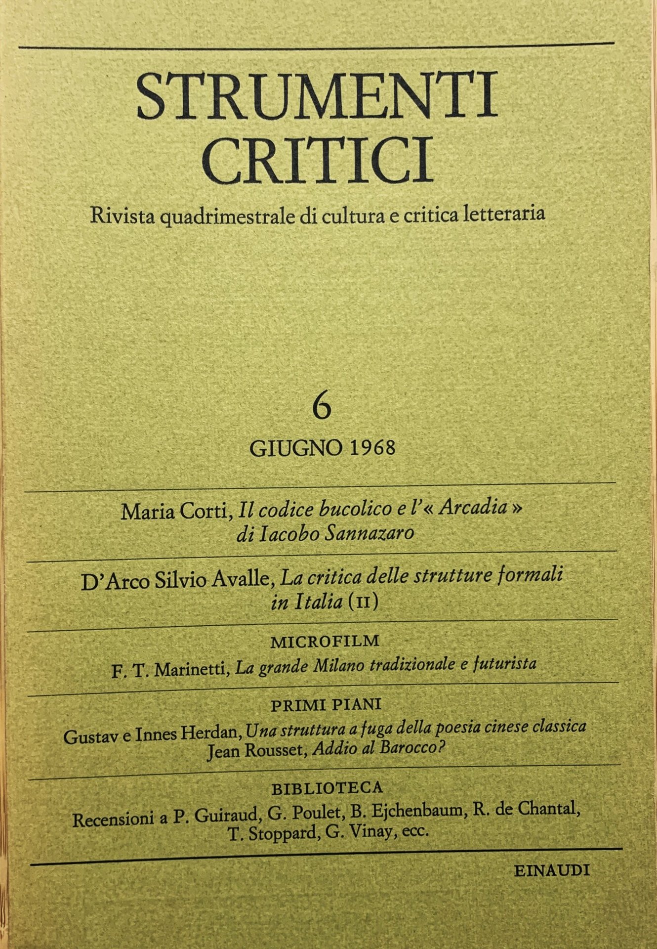 I ed.: 29 giugno 1968. Anno II febbraio 1968 fascicolo I n. 6 di Strumenti critici. Rivista quadrimestrale di cultura e critica letteraria. VIII/ 141-268/ brossura in cartoncino ruvido verde oliva con titoli in nero. Stato buono. Sommario: Maria Corti; Il codice bucolico e l' "Arcadia" di Jacobo Sannazaro - D'Arco Silvio Avalle; La critica delle strutture formali in Italia (II) - Microfilm (Filippo Tommaso Marinetti; La grande Milano tradizionale e futurista (carte inedite) (a cura di L. De Maria)) - Primi piani (Gustav e Innes Herdan; Una struttura a fuga della poesia cinese classica - Jean Rousset; Addio al Barocco?) - Biblioteca (Pierre Guiraud; Structures étymologiques du lexique français (Cesare Segre) - Georges Poulet; Les chemins actuels de la critique (Cesare Segre) - Boris Ejchenbaum; Il giovane Tolstoj. La teoria del metodo formale (Cesare Segre) - René de Chantal; Marcel Proust critique littéraire (Giorgetto Giorgi) - Tom Stoppard; Rosencrantz and Guildenstern are dead (Franco Ferrucci) - Gustavo Vinay; Pretestii della memoria per un maestro (Luigi Testaferrata)) - Note sui collaboratori.