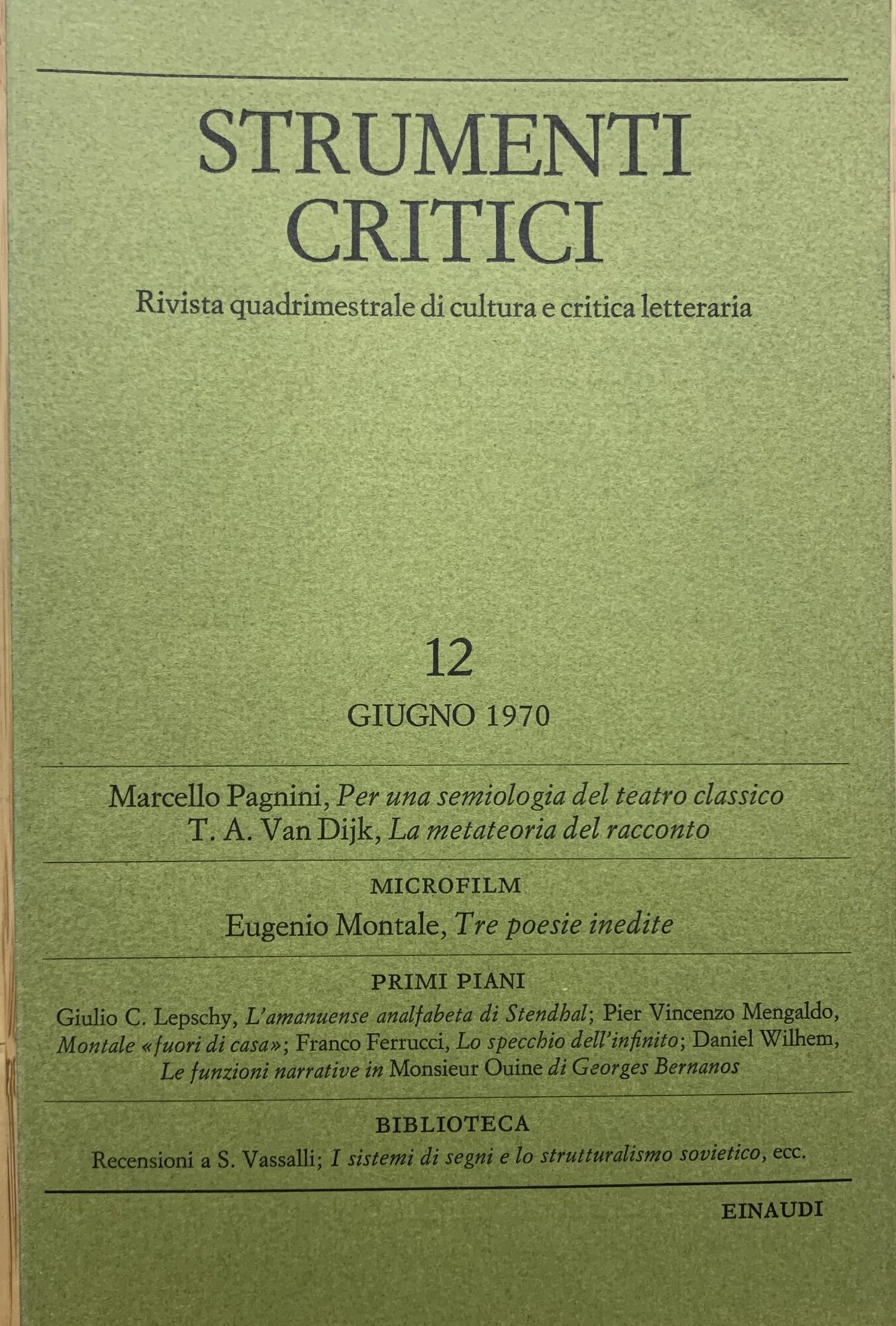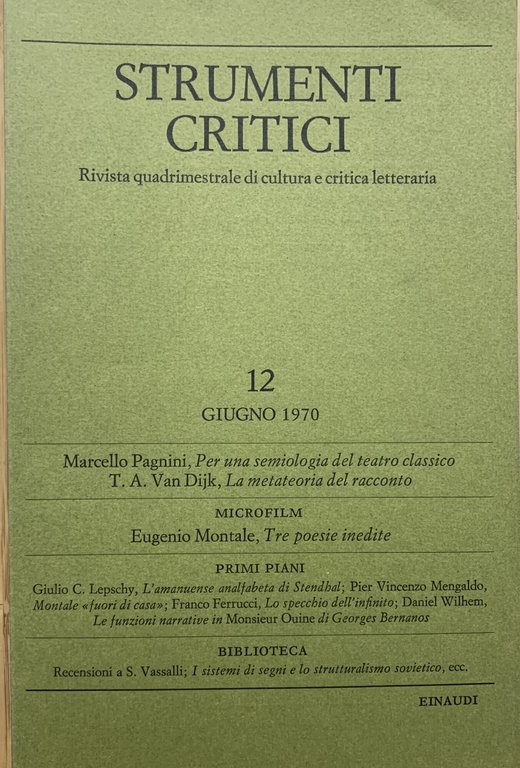 I ed.: 29 agosto 1970. Anno IV giugno 1970 fascicolo II n. 12 di Strumenti critici. Rivista quadrimestrale di cultura e critica letteraria. VIII/ 121-240+(2)/ brossura in cartoncino ruvido verde oliva con titoli in nero. Stato buono. Sommario: Marcello Pagnini; Per una semiologia del teatro classico - T. A. Van Dijk; La metateoria del racconto - Microfilm (Eugenio Montale; Tre poesie inedite) - Primi piani (Giulio C. Lepschy; L'amanuense analfabeta di Stendhal - Pier Vincenzo Mengaldo; Montale "fuori di casa" - Franco Ferrucci; Lo specchio dell'infinito - Daniel Wilhem; Le funzioni narrative in "Monsieur Ouine" di Georges Bernanos) - Biblioteca (Sebastiano Vassalli; Tempo di màssacro (Maria Corti) - AA.VV.; I sistemi di segni e lo strutturalismo sovietico, a cura di Remo Faccani e Umberto Eco (Maria Corti) - Società di linguistica italiana; La grammatica. La lessicologia, Atti del I e del II convegno di studdi-La sintesi, Atti del III convegno internazionale di studi (Roma, 17-18 maggio 1969) (Bice Garavelli Mortara)) - Notizie sui collaboratori.