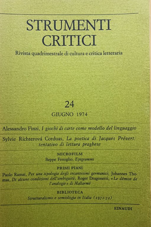 I ed.: 31 ottobre 1970. Anno IV ottobre 1970 fascicolo III n. 13 di Strumenti critici. Rivista quadrimestrale di cultura e critica letteraria. VIII/ 243-346+(2)/ brossura in cartoncino ruvido verde oliva con titoli in nero. Stato buono. Sommario: Jean Starobinski; Il pranzo di Torino - Microfilm (Una lettera di Ermes Visconti) - Primi piani (Piero Raffa; Estetica semiologica e letteratura - Guido Almansi; Lettura della quarta novella del "Decameron" - Gian Paolo Caprettini; Grammatiica del fumetto) - Biblioteca (Jean Rychner; Formes et structures (Cesare Segre) - Leonard Forster; The icy Fire (Guido Almansi) - A. J. Greimas; Du sens (Stefano Agosti) - Marcello Pagnini; Critica della funzionalità (Cesare Segre) - John Lyons; Structural Semantics, etc. (Lorenzo Renzi) - Notizie sui collaboratori.