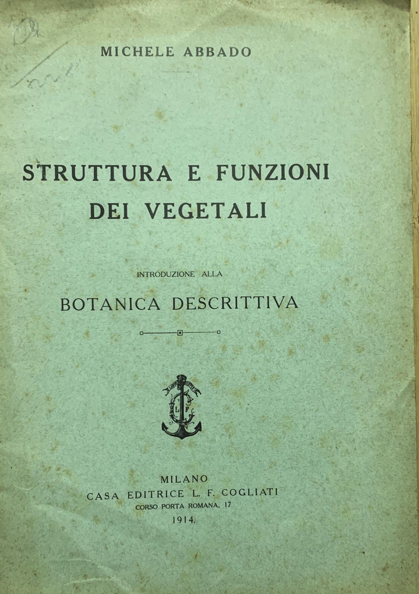I ed.. VIII/ 36/ brossura in cartoncino liscio azzurro melange con titoli in nero. Con illustrazioni in b/n nel testo. Stato buono (usura della copertina ai margini e al dorso copertina con bruniture e fioriture - pagine brunite). Indice: I tipi vegetali - Struttura e funzioni delle Fanerogame (Organi delle Fanerogame - Radice (Le due funzioni della raddice - Formazioni di radici avventizie - Radici acquatiche ed eree) - Fusto (Forma del fusto - Forme speciali di fusti) - Foglia (Forma della foglia - Varie forme del lembo fogliare - Forme speciali della foglia) - Allungamento del fusto - Allungamento della radice - Struttura interna del fusto (Dicotiledoni e Gimnosperme - Corteccia- Cilindro centrale - Accrescimento del fusto in spessore - Monocotiledoni) - Struttura interna della radice - Struttura interna della foglia - Respirazione - Costituzione del legno e del libro - Nutrizione della pianta (Assorbimento radiccale - Assimilazione del carbonio - Come il carbonio esiste nell'aria - Come la pianta utilizza il carboni - Copncentrazione delle sostanze minerali - Perché la pianta può assimilare il carbonio? - Risultato dell'assimilazione - trasporto delle sostanze plastiche - Importanza dell'assimilaziione del carbonio) - Piante carnivore - Piante parassite - Riprodduzione (Il Fiore - Piaante dioiche, monoiche, ermafrodite - Formazione del seme - Fecondazione incrociata - Azione degli insetti e del vento - Formazione del frutto - Diffusione dei semi (disseminazione) - Varie forme di frutti - Struttura interna del seme - Germinazione del seme) - Moltiplicazione - Divisione delle Fanerogame) - Osservazioni sugli altri tipi vegetali (Tipo delle Pteridofite - Tipo delle Muscinee - Tipo delle Tallofite).