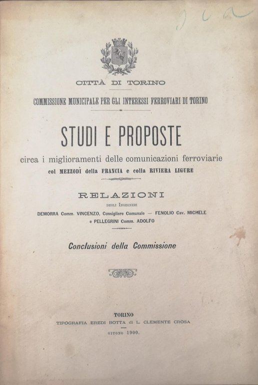 STUDI E PROPOSTE CIRCA I MIGLIORAMENTI DELLE COMUNICAZIONI FERROVIARIE COL MEZZODI' DELLA FRANCIA E COLLA RIVIERA LIGURE. - Città di Torino.