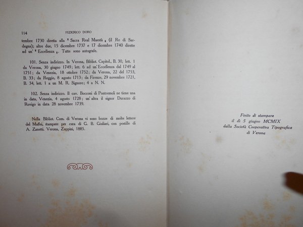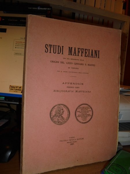 DORO, FEDERICO. Torino, Fratelli Bocca Editori, 1909. STUDI MAFFEIANI CON UNA MONOGRAFIA SULLE ORIGINI DEL LICEO Ginnasio S. Maffei di Verona. In-8° grande br. edit. (cm. 28); pp. 114, (2). Ed. illustrata. Ampia bibliografia Maffeiana. La prima partepresenta le edizioni a stampa del Maffei. La seconda parte riporta le edizioni che presentano giudizi, elogi e note biografiche sul Maffei. La terza parte i "Manoscritti". Uff. E - I - 1 - 2