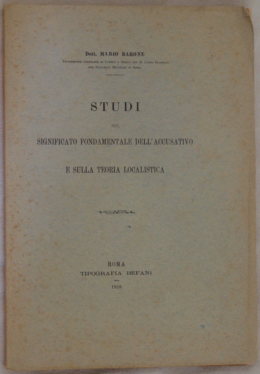 In 8. Dim. 25,5x18 cm. Pp. 140. Interessante pubblicazione del 1926 del Dott. Mario Barone professore di greco e latino nel Regio Liceo Classico di Roma. Si tratta di una raccolta di studi sul significato fondamentale dell'accusativo e sulla teoria localistica. In ottime condizioni. Copertina editoriale in ottime condizioni generali con lievi usure ai margini e dorso. Legatura in ottime condizioni. All'interno le pagine si presentano in ottime condizioni con rare fioriture, ancora unite fra loro. Interesting pamphlet of 1926 by Dott. Mario Barone teacher of greek and latin in the Regio Liceo Classico in Rome. It is a collection of studies about the main meaning of accusative and local theory. In very good conditions. Editorial cover in very good general conditions slightly worn in the edges and spine. Binding in very good conditions. Inside pages are in very good conditions with occasional foxings, still bound together.