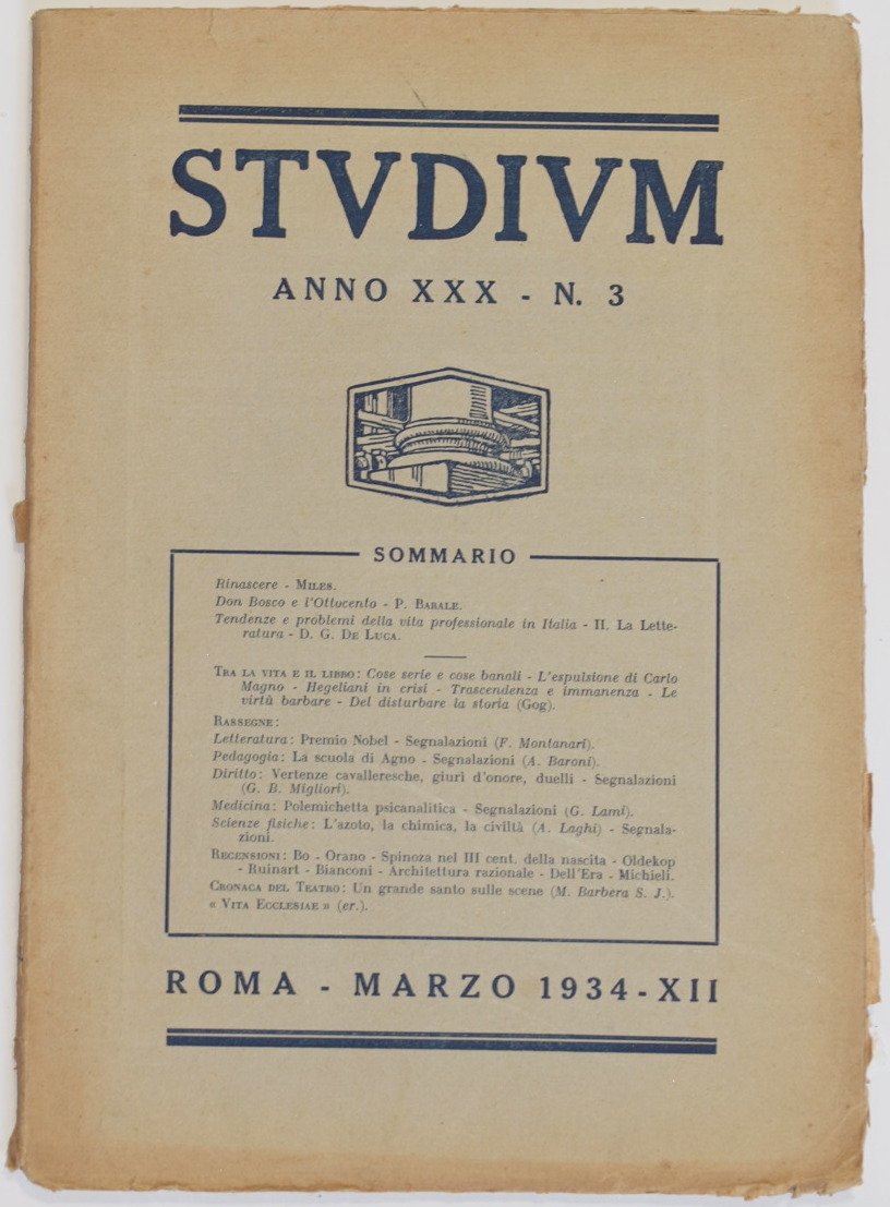 In 8. Dim. 25,5x18 cm. Pp. da 153 a 224. Numero del marzo 1934 di questa rivista "Studium". Tra gli articoli presenti: Don bosco e l'ottocento, Problemi della vita professionale in Italia, Espulsione di Carlo Magno, Premio Nobel, La scuola di Agno, Vertenze cavalleresche giuri duelli, Bo-Orano: Spinoza nel III cent. dalla nascita, Oldekop Ruinart Bianconi Architettura razionale ecc. In buone condizioni. Brossura editoriale in buone condizioni generali con lievi usure e parti mancanti ai margini e dorso. Piatti staccati. Legatura in buone condizioni. Pagine in buone condizioni con rare fioriture.Number of march 1934 of this italian magazine "Studium". Between the articles inside: Don bosco and XIX century, problems of professional life in Italy, Expulsion of Carlo Magno, Nobel prize, The school of Agno, Chevalry duels, Bo-Orano: Spinoza during III cent. from his bearing, Oldekop Ruinart Bianconi Rational architecture etc. In good conditions. Editorial cover in good general conditions slightly worn with missing parts in the edges and spine. Foxings. Binding in good conditions. Pages are in good conditions with occasional foxings and some tears.