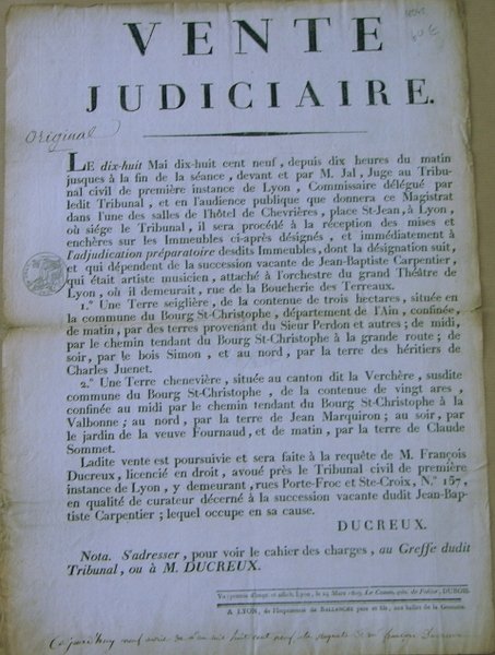 Affichette de 42 x 30 cm - imprimerie Ballanche, Lyon, 1809. Un tampon en marge gauche du document et une mention manuscrite en bordure inférieure et "original" écrit sous le titre. Bon état. Intéressant document reprenant des mentions géographiques "au soir", "au matin" pour situer les terres en question.