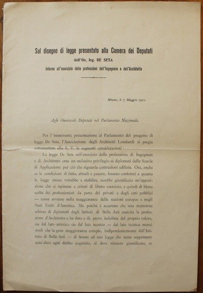 Sul disegno di legge presentato alla Camera dei Deputati intorno all'esercizio delle professioni dell'Ingegnere e dell'Architetto