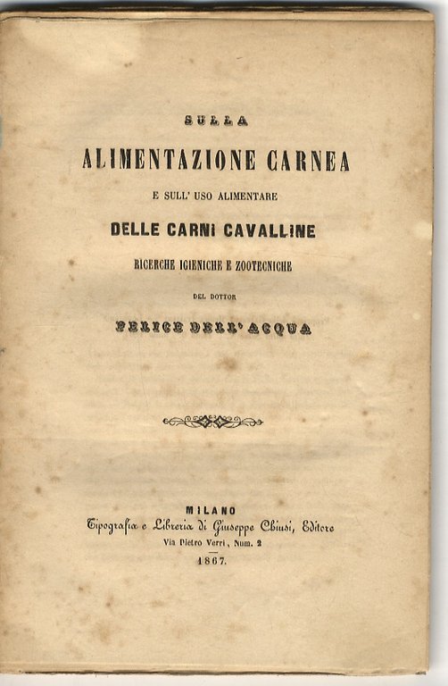 Sulla alimentazione carnea e sull'uso alimentare delle carni cavalline. Ricerche igieniche e zootecniche del dottor Felice Dell'Acqua.