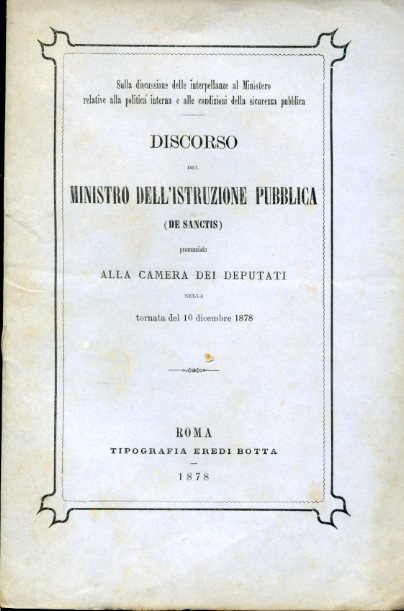 Sulla discussione delle interpellanze al Ministero relative alla politica interna e alle condizioni della sicurezza pubblica. Discorso del Ministro dell'Istruzione Pubblica pronunziato alla Camera dei Deputati nella tornata del 10 dicembre 1878 | Libri antichi e moderni | De Sanctis Francesco