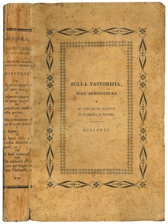 Mm. 223x135. Pp. XVI, 331. Esemplare in barbe, rare e occasionali fioriture alle cc. Brossura editoriale con titolo al dorso e alla cop. anteriore. Cop. brunita e lievemente fiorita, mancanze alle cuffie. Prima edizione di questi Discorsi del veneziano Dandolo, in cui si danno notizie circa gli allevamenti di pecore di razza spagnola, sulla coltivazione delle patate, sull'impiego dei letami in agricoltura, sulla frantumazione delle proprietà terriere e danni economici, degli ampi possedimenti dei beni comunali, sulla necessità per l'economia italiana di promuovere la navigazione e i commerci marittimi, soprattutto sul Mar Nero e nei rapporti con la Turchia.