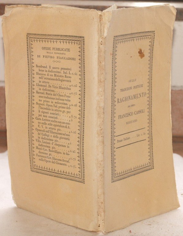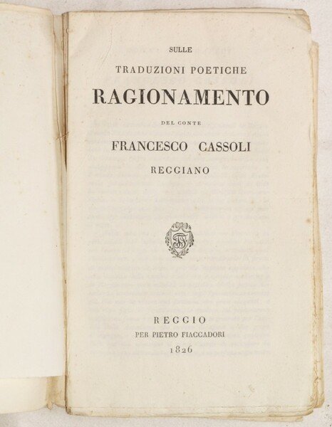 In 8. Dim. 23,5x14,5 cm. Pp. XII+67. Rarissima prima edizione del 1826 di questa opera del Conte Francesco Cassoli (1749-1812) di Reggio. L'opera venne scritta trent'anni prima ma pubblicata postuma nel 1826 e poi mai più ristampata se non oggi in edizione moderna. Si tratta di un interesante saggio sulla traduzione corredato di esempi in difesa della traduzione in generale, quella poetica in particolare. In ottime condizioni, pagine ancora da tagliare. Brossura editoriale originale. Brossura editoriale in buone condizioni generali con lievi usure ai margini e dorso; macchia al piatto anteriore. Legatura allentata in discrete condizioni. All'interno le pagine si presentano in ottime condizioni con rare fioriture. Very scarce first edition of 1826 of this work by the Count Francesco Cassoli (1749-1812) from Reggio. The work was written thirty years before but published posthumous in 1826 and then never republished apart for a modern edition. It is an interesting essay about translation with examples in defence of translation in general, in poetical translation in particular. In very godo conditions, pages must still be cut. Editorial original cover. Editorial cover in good general conditions slightly worn in the edges and spine; stain in the front plate. Binding in fair conditions. Inside pages are in very good conditions with occasional foxings.