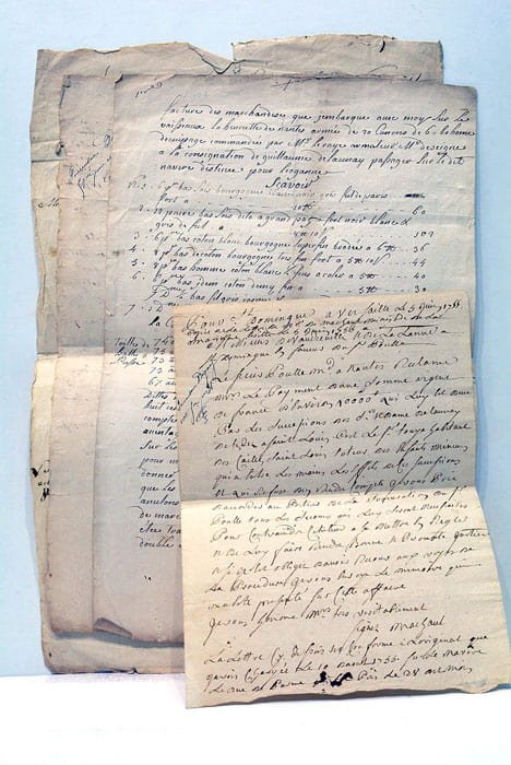 Dossier Manuscrit de 4 pages. (36x23 Cm). 4 feuilles. Requête d'un marchand de Nantes pour obtenir réglement des sommes avancées en argent et en marchandises à un certain Delaunay à son départ pour St. Domingue. Son débiteur étant décédé aux Colonies ainsi que son épouse, il demande aux autorités d'obliger les héritiers habitant de Saint-Domingue à payer la dette. Outre cette requête, on trouve dans ce dossier 2 autres documents concernant cette affaire ainsi qu'une facture datée de 1746 et signée par le Sieur Delaunay donnant le détail des marchandises avec leurs prix embarqués à destination de Leogane sur la vaisseau "La Henriette". Traces de plis. Petites déchirures. Taches.