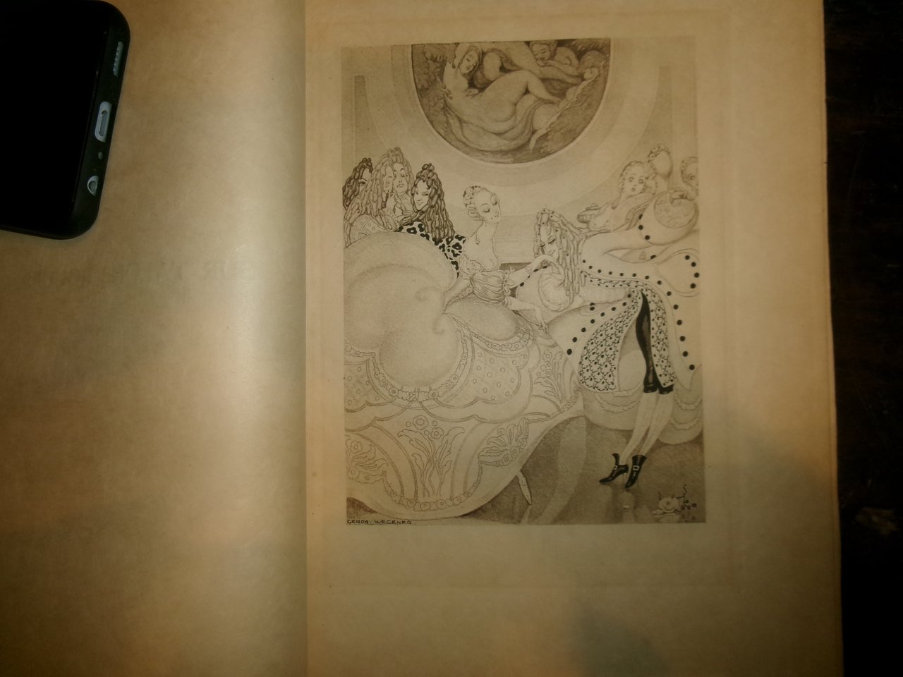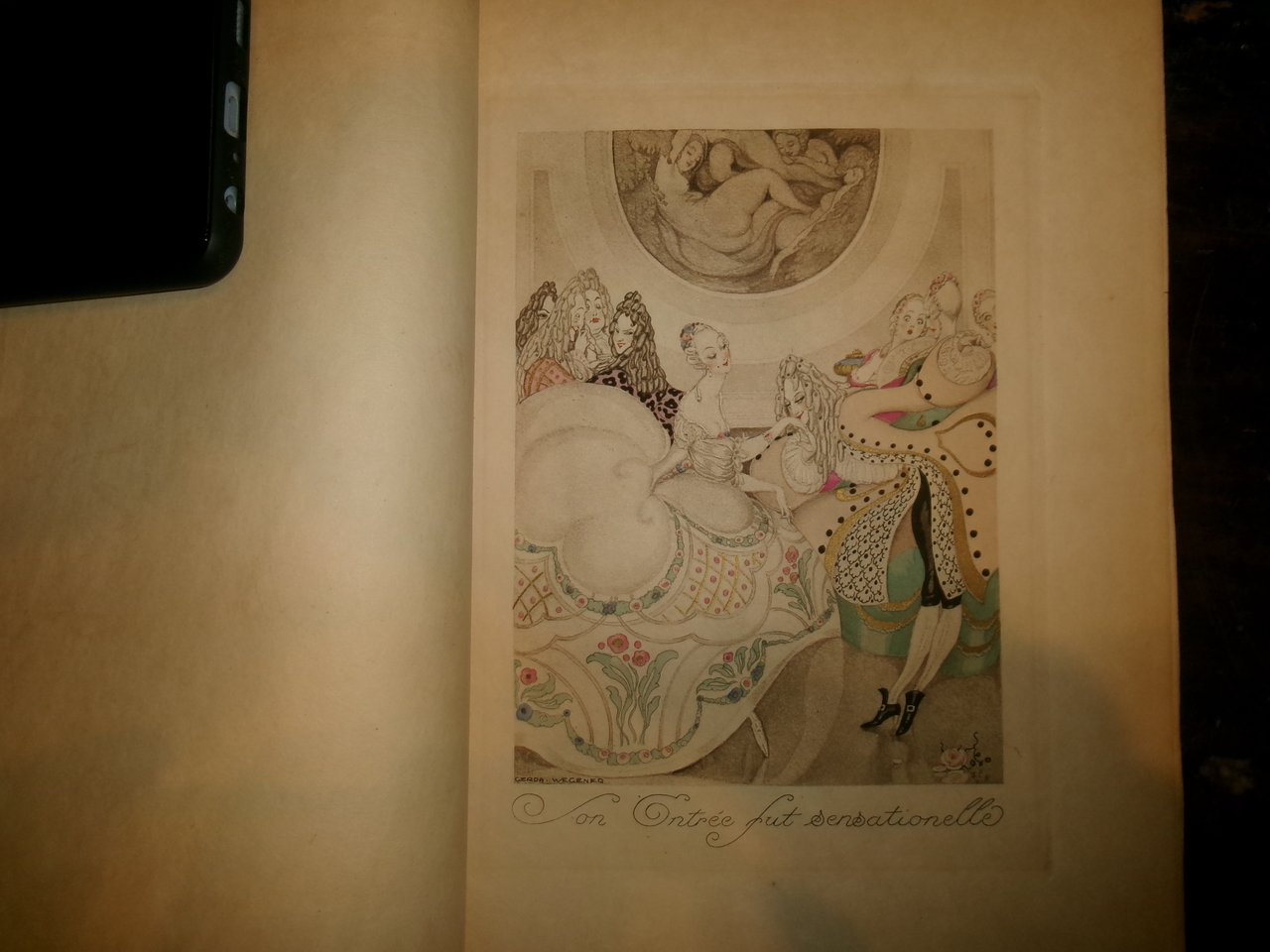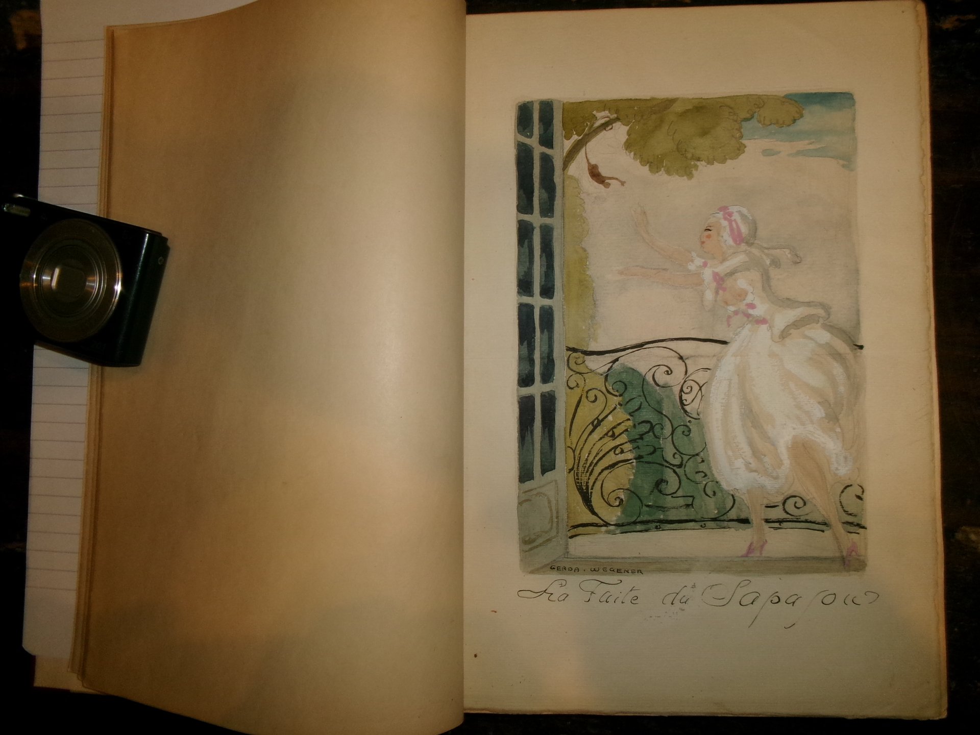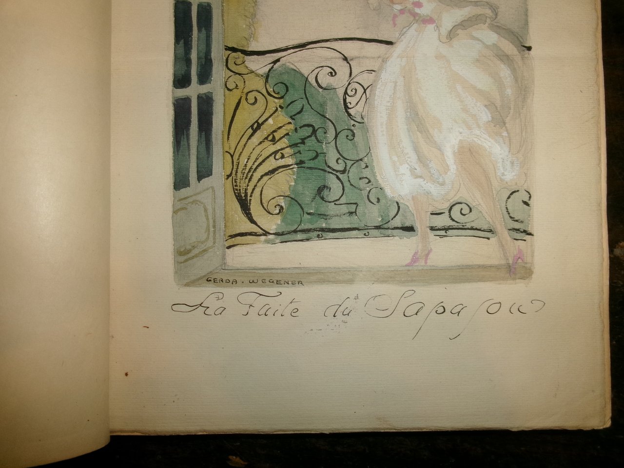 Paris, G.Briffaut, (1929) 1929. SUR TALONS ROUGES, ACQUARELLES DE GERDA WEGENER. IN-4, ° BELLISSIMA LEGATURA DA AMATORE IN M. MAROCCHINO CILINDRATO ROSSO, TASSELLO VERDE CON TITOLO IN ORO, PIANI CON LE ESTREMITÀ PURE IN MAROCCHINO ESTESO DA ANGOLO AD ANGOLO, COPERTINE E DORSO ORIGINALI CONSERVATE. 154, (2)PP. CON 24 ARTISTICHE ILLUSTRAZIONI F. T. DI GERDA WEGENER IN DOPPIO STATO. ( 12 IN BISTRO + 12 ACQUERELLATE << AU POCHOIR >>). UNO DEI 25 ESEMPLARI NUMERATI << SUR VERGÉ D' ARCHES>> N° 14 ). LE ILLUSTRAZIONI SONO CARATTERIZZATE DA UN ESTRO PERSONALE DELICATO, GALANTE ED EROTICO. BELLISSIMO ESEMPLARE INTONSO IMPREZIOSITO DALL' AGGIUNTA DI UN FOGLIO SEPARATO NEL QUALE SI TROVA UN MAGNIFICO ACQUERELLO ORIGINALE DI GERDA WEGENER DELLO STESSO FORMATO DELLE TAVOLE. E' NOTO CHE GLI ACQUERELLI DELL' ARTISTA A SÈ STANTI SONO DI NOTEVOLE RARITÀ. OPERA PREGEVOLISSIMA. CARTERET, V, P. 11, MONOD, 181. DICTIONNAIRE DES ILLUSTRATEURS P. 1117.Gerda Marie Fredrikke Gottlieb, nasce nel 1886 in una famiglia francese emigrata in Danimarca nel XVIII sec. Cresciuta in provincia, Gerda si trasferisce nella capitale a Copenaghen per frequentare l'Accademia di Belle Arti, nella quale conosce e infine sposa Einar Wegener, che diverrà Lili Elbe, la prima persona nella storia ad essersi sottoposta ad un intervento chirurgico di riassegnazione sessuale.