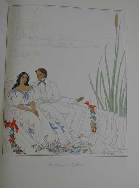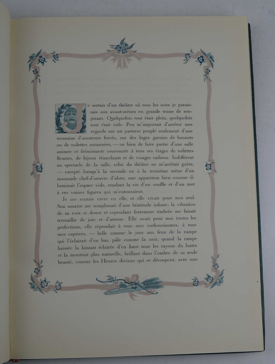 Cm. 34, pp. (60). Testo interamente incorniciato da decorazione floreale ed intercalato da 14 belle litografie a colori f.t. per opera di Vittorio Accornero de Testa (ciascuna protetta da velina). Solida ed elegante legatura coeva in pieno marocchino verde, dorso liscio con titoli in oro e piatti con duplice filetto. Taglio di testa dorato. Appena un po' scolorito il dorso, peraltro esemplare in perfetto stato di conservazione. Edizione a tiratura limitata di 500 esemplari numerati. Il nostro porta in n. 5 e la firma dell'artista.