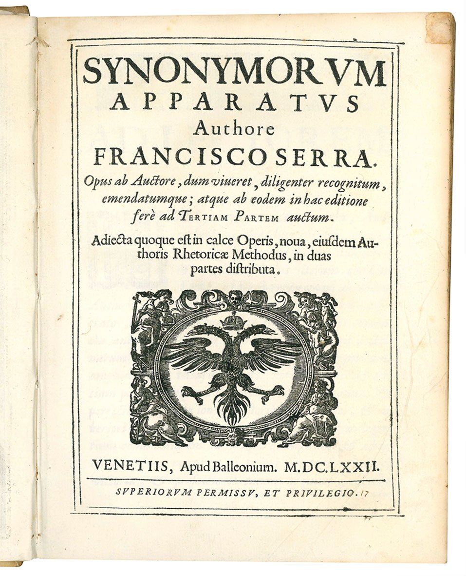 Synonymorum apparatus authore Francisco Serra. Opus ab auctore, dum viveret, diligenter recognitum, emendatumque; atque ab eodem in hac editione fere ad tertiam partem auctum. Adiecta quoque est in calce operis, noua, eiusdem authoris rhetoricæ Methodus, in duas partes distributa.