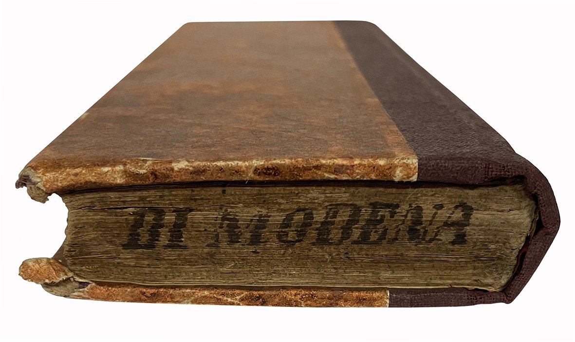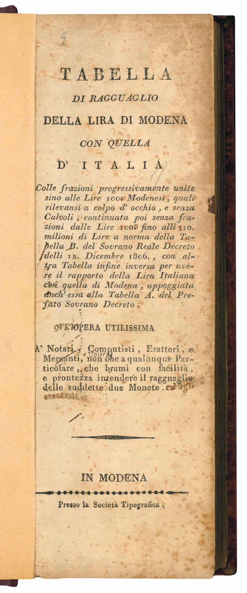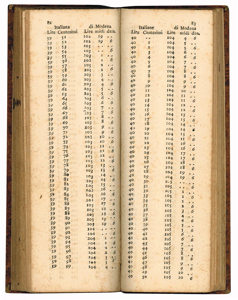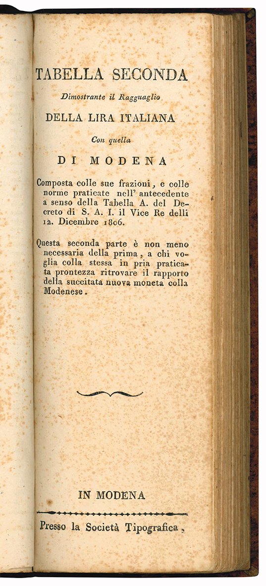 In 8vo oblungo (mm 238x78); pp. 103, [1], 11, [1], [2], 203, [1], 11, [1]. Il volume contiene anche: Tabella addizionale dimostrante il ragguaglio tra la lira modonese e l'italiana ...; Tabella seconda dimostrante il ragguaglio della lira italiana ...; Tabella addizionale dimostrante il ragguaglio tra la lira italiana ... Carta leggermente ed uniformemente brunita, lievi fioriture diffuse. Mezza tela moderna, piatti rivestiti con carta marmorizzata. Titolo al taglio inferiore e superiore.