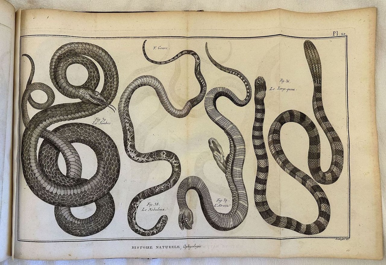 Splendido volume facente parte dell'imponente "Encyclopedique methodiqus des trois Regnes de la nature" pubblicata dal sacerdoto e zoologo Pierre Joseph Bonnaterre (1752-1804) tra il 1788 e il 1827. Questo volume è interamente dedicato alla cetologia e l'erpetologia e diede un importante contributo alla nomenclatura e tassonomia erpetologica. Nella prima parte testo con divisione sistematica e dettagliate descrizioni con nomi di nuove specie. Seguono 88 tavole fuori testo qualcuna ripiegata. In buone condizioni. Copertina in piena pelle coeva con titolo e decorazioni in oro al dorso in discrete condizioni generali con lievi usure ai margini e dorso. usure e rotture. Legatura in buone condizioni. Pagine in buone condizioni con fioriture. In 4. cm 28,5x22. Pp. 272+(88) pl.