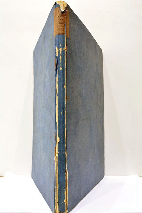 2 ouvrages en 1 volume: 1) 1 feuillet. 165 pages. 2). 7 pages. (29x28,5 Cm). Cartonnage bleu de l'époque. Titre au dos. Charnières fendues. Coins et coiffes émoussés. Petits manques de papier. Taches et rousseurs. Au cours de la période dans laquelle Hansen a commencé sa carrière, a eu lieu un développement continu des instruments astronomiques et une maturité croissante des mathématiques. Il y avait un désir politique d'améliorer la précision pour déterminer les longitudes. A cet effet, des travaux ont été effectués sur des montres plus précises et une amélioration des tables astronomique pour le Soleil, les planètes et la Lune pour donner des observations et une théorie analytique plus précises. Le travail de Hansen a couvert tout ce développement: Il a compris l'instrumentation et a développé de nouvelles méthodes de traitement des données statistiques et techniques d'observation. Il a développé les méthodes analytiques nécessaires pour calculer les tables du mouvement du Soleil et de la Lune. Cette publication exécuté d'après les ordres de la Sociéte Royale des sciences de Copenhague est le résultat du travail que Hansen a fait avec C. F. R Olufsen pour créer des tablaux du mouvement du soleil couvrant 3000 ans à partir de 800 avant J.C. Olufsen a traité les matériaux qui ont ensuite été défendu par Hansen. Notre exemplaire contient le supplément élaboré par Hansen dans le but de donner des précisions sur les calculs presentées dans la 1ère partie du livre.