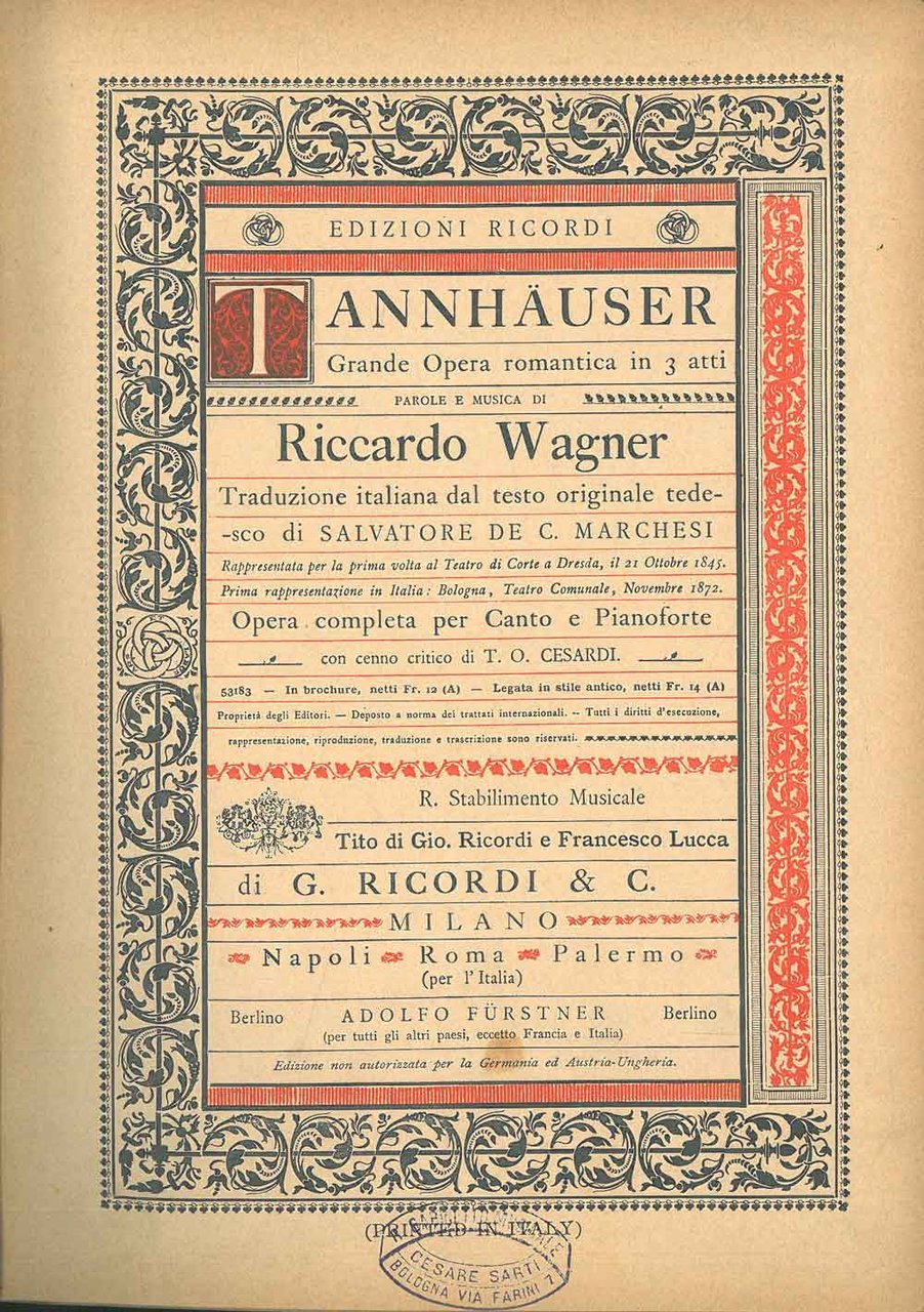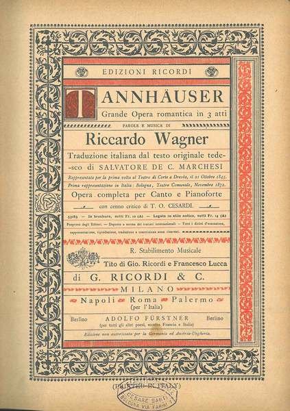 Tannhauser. Grande opera romantica in 3 atti. Opera completa per canto e pianoforte (N. 53183) Traduzione italiana dal testo originale tedesco di Salvatore De C. Marchesi