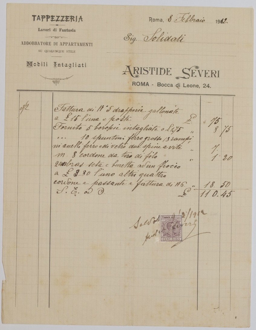 Bella fattura del 8 febbraio 1912 della "tappezzeria Aristide Severi" di Roma. Lista del materiale acquistato con i prezzi Bollo firmato. In buone condizioni, piegature e parti mancanti Dim. cm 27,5x21,5. Beautiful invoice of the 8th of february 1912 of the shop "tappezzeria Aristide Severi" in Rome. List of material and price. Stamp with signature. In good conditions, foldings and missing parts.