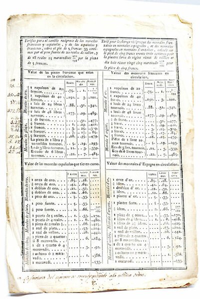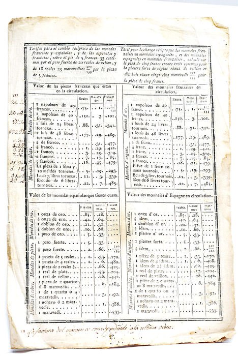 2 feuillets. (31x21 Cm). En feuilles tel que paru. Légère mouillure. Petits accrocs. Rousseurs. Rarissime tableau de conversion monétaire bilingue, publié pendant l'occupation française afin de donner le change des monnaies. Le document émane sans doute de la commission créée en 1808 dans le but de fixer les taux de change entre les monnaies des deux pays, suite à l'occupation du pays par les troupes françaises de Napoléon et à l'ascension sur le trône d'Espagne de Joseph Bonaparte. Inscriptions manuscrites aux marges. Papier bruni, taches et traces de mouillure.