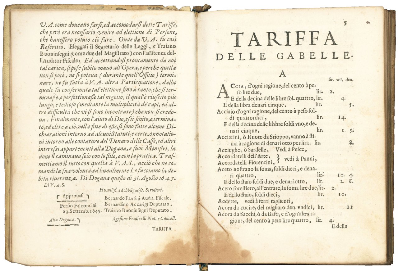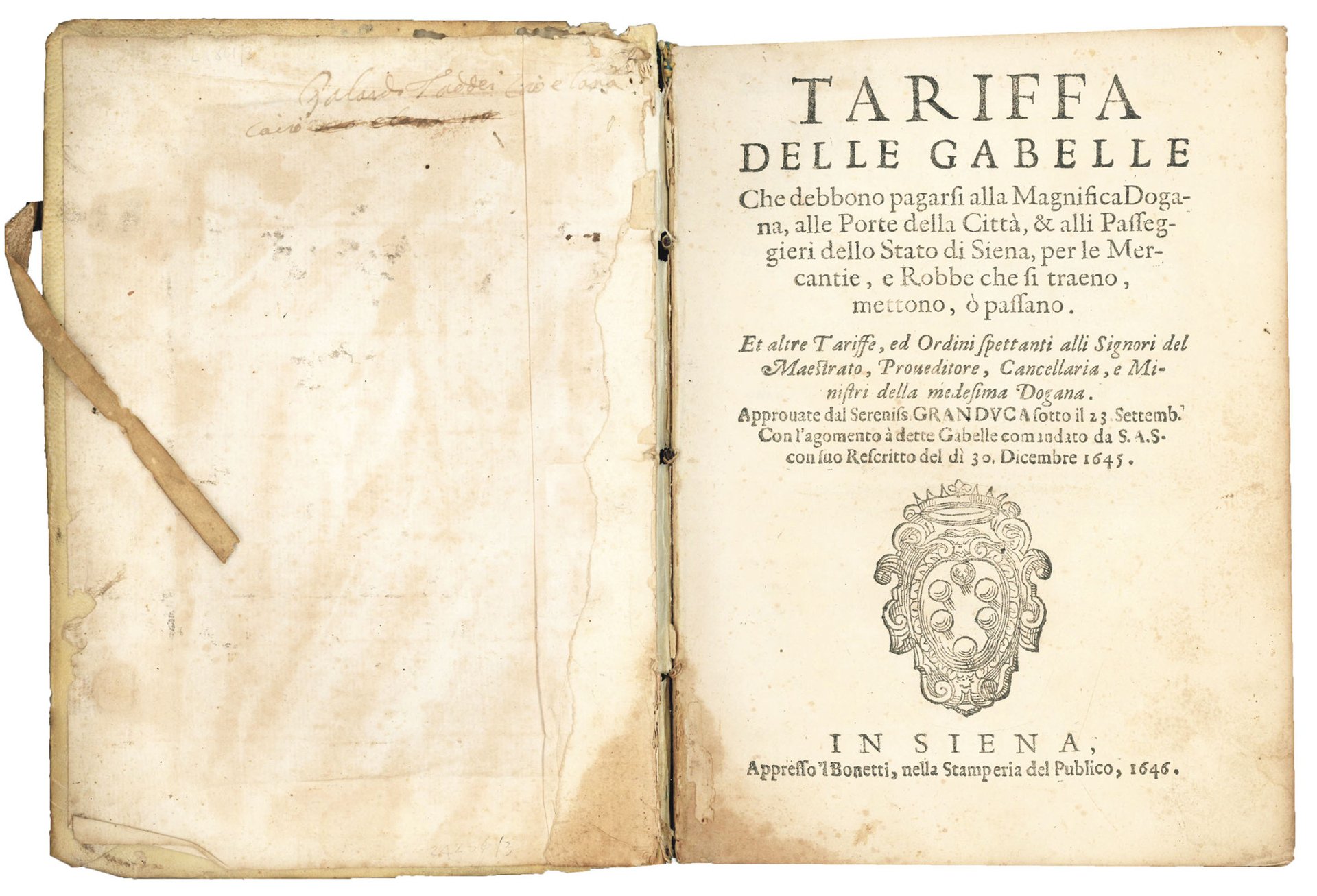 Tariffa delle gabelle, che debbono pagarsi alla Magnifica Dogana, alle Porte della Città, & alli Passaggieri dello Stato di Siena, per le Mercantie, e Robbe, che si traeno, mettono, ò passano. Et altre Tariffe, ed Ordini spettanti alli Signori del Maestrato, Proveditore, Cancellaria, e Ministri della medesima Dogana. Approvate dal Sereniss. Granduca sotto il 23 Settemb. Con l'argomento à dette Gabelle comandato da S.A.S. con suo Rescritto del dì 30. Dicembre 1645