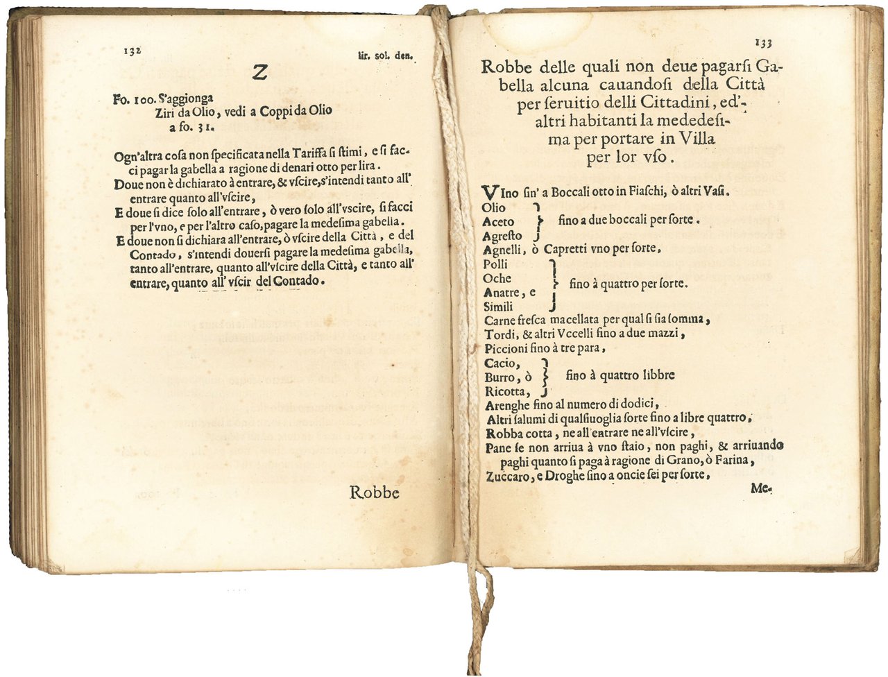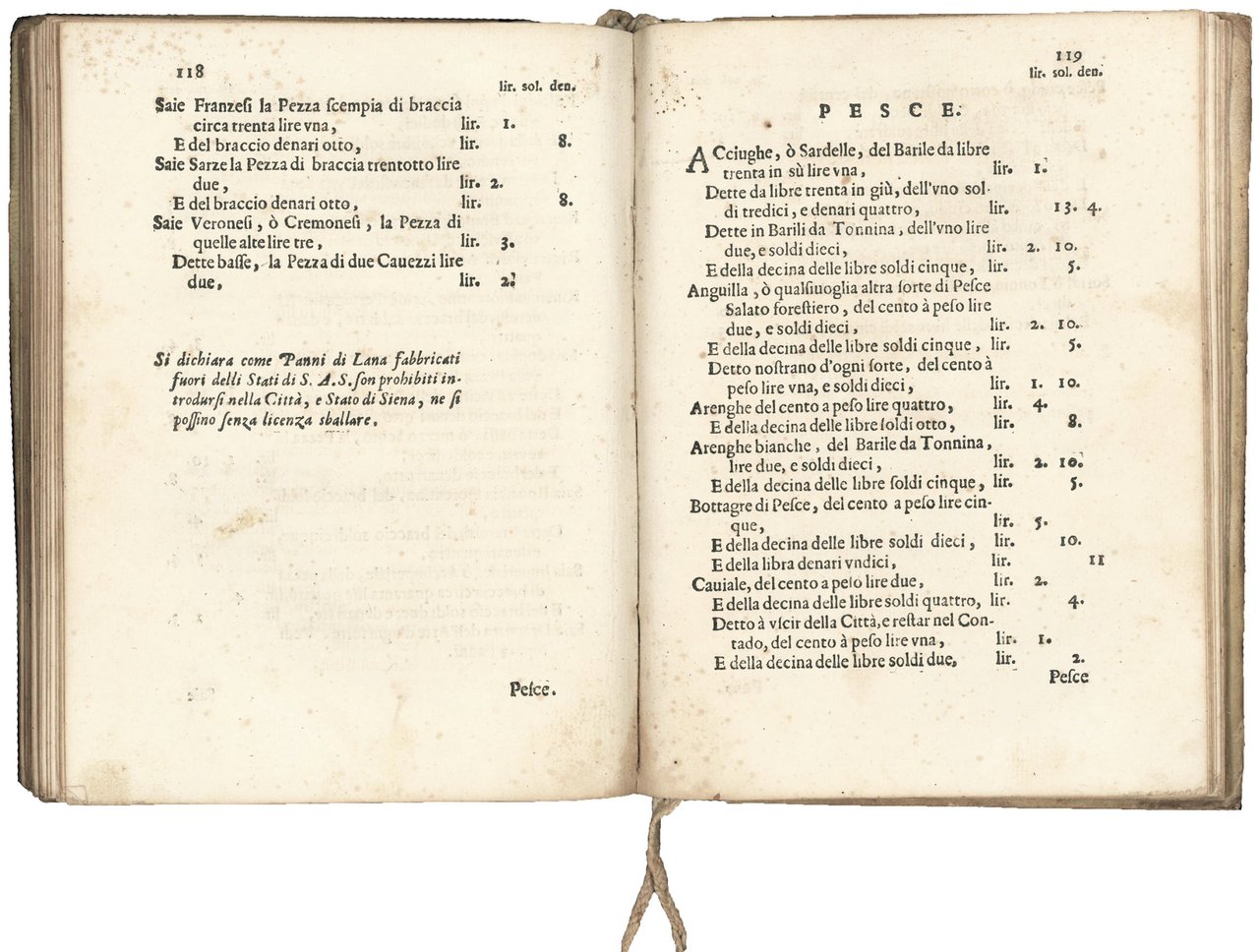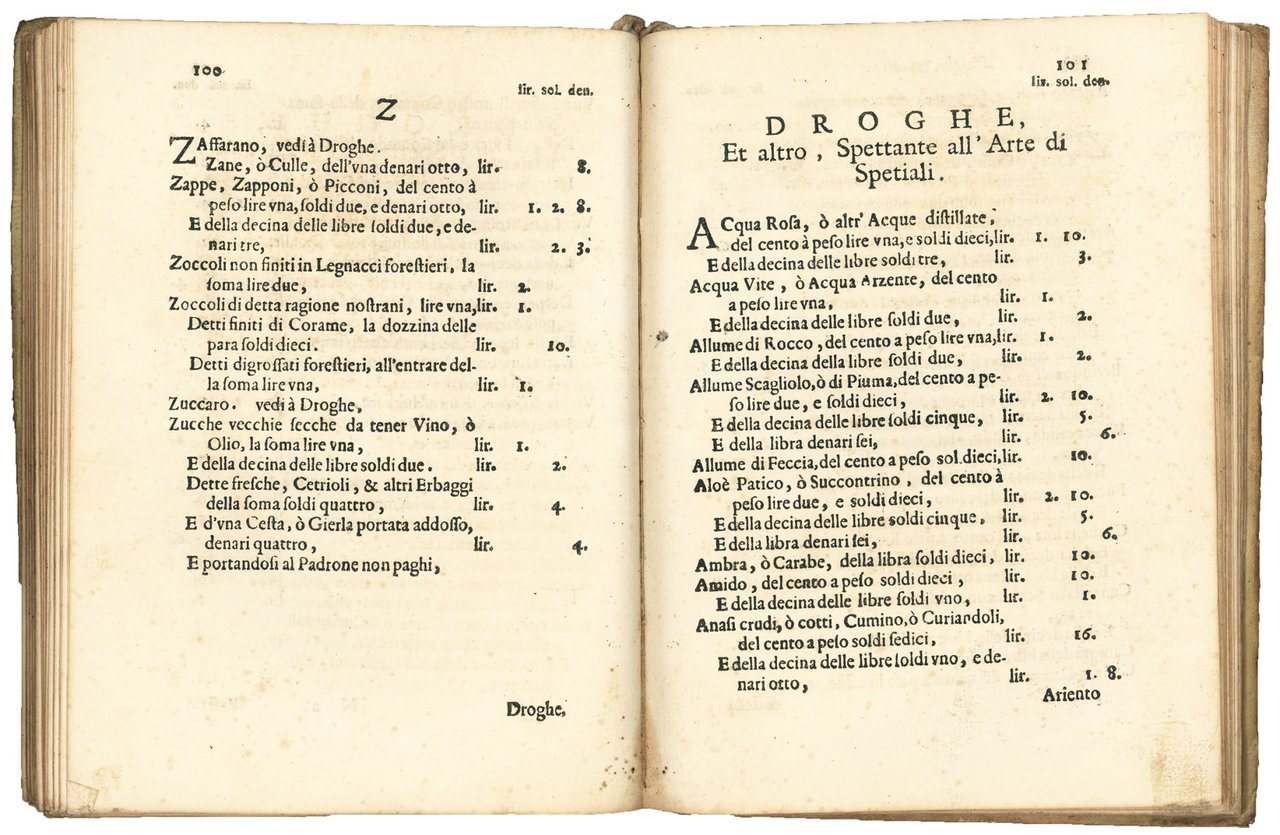 Rarissima prima edizione (seguiranno ristampe aggiornate nel 1664, 1775, 1781 e 1783) del tariffario delle gabelle da pagarsi per tutti i beni, elencati in ordine alfabetico, che devono entrare nella città di Siena.