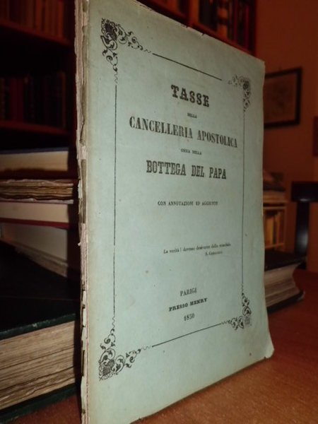 Tasse della Cancelleria Apostolica ossia della Bottega del Papa. Con annotazioni ed aggiunte. Parigi, presso Enry, 1850. In - 16°, br., cop. orig. xii, 112 pp. Bell' esemplare di questo opuscolo raro. (.Le Tasse.della Penitenziera romana, delle quali dal 1848 in poi se ne sono fatte le migliaia di citazioni, e sen' è sparlato,. non trovandosene copia in commercio né nell' originale idioma latino, né voltate in italiano. totalmente esaurita. venutoci il pensiero di farne una versione nell' italiano idioma, affinché .si potesse conoscere questo bel libro. si potrà credere .che immenso fosse il numero di coloro che accorrevano a comperare le indulgenze e le assoluzioni. con poco denaro per qualsiasi peccato. Neg. mob. 1