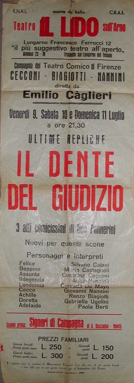 TEATRO Il Lido sull'Arno. Lungarno Francesco Ferrucci 12 "il più suggestivo teatro all'aperto" [.] Compagnia del Teatro comico di Firenze, Cecconi - Biagiotti - Nannini, diretta da Emilio Càglieri. Venerdì 9, sabato 10 e domenica 11 luglio a ore 21,30 ultime repliche: Il dente del giudizio, 3 atti comicissimi di Ugo Palmerini, nuovi per queste scene. Personaggi ed interpreti: [segue l'elenco].
