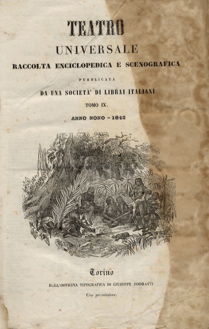 TEATRO Universale. Raccolta enciclopedica e scenografica pubblicata da una Società di librai italiani. Tomo IX. Anno nono. 1842. Dal n. 391 dell'8 gennaio 1842 al n. 441 del 24 dicembre 1842. [ma mancano l'intero ultimo fascicolo, n. 442 e le pp. 177, 178, 179, 180 181, 182, 183, 184 (fascicolo n. 413)].
