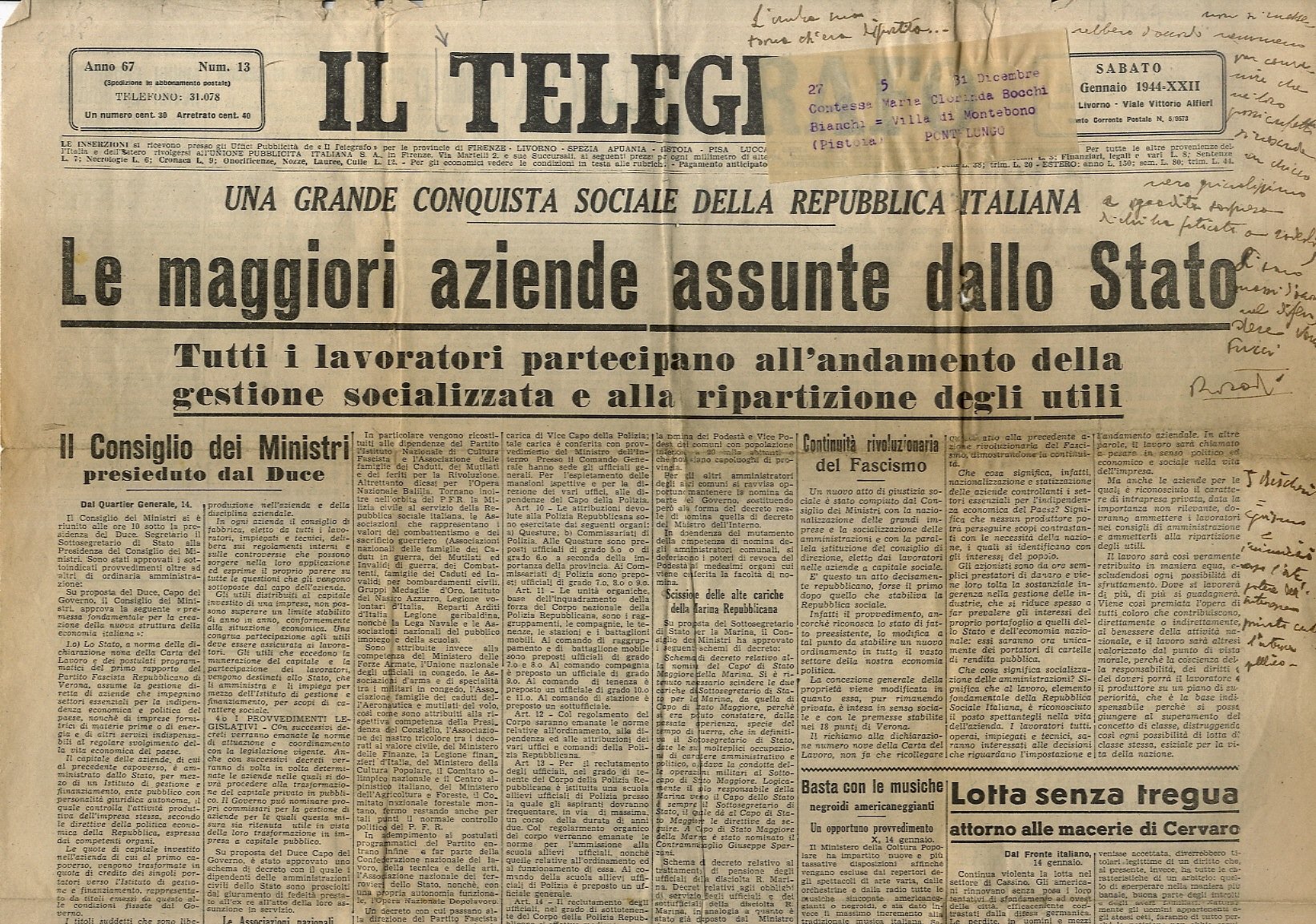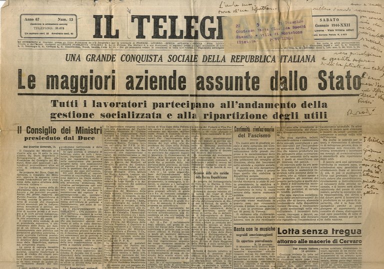 Livorno, 1944, un foglio delle misure d'un giornale quotidiano, pp. [2]. Il titolo in prima pagina, a piene colonne - "Una grande conquista sociale della Repubblica Italiana. Le maggiori aziende assunte dallo Stato" - testimonia la "socializzazione delle imprese" voluta dalla Repubblica Sociale Italiana. Alcune note manoscritte in epoca coeva alla pubblicazione sul margine bianco alto, fra le quali spicca la citazione dantesca: "L'ombra sua torna ch'era dipartita.". Lievi strappettini marginali, tracce di piegature.