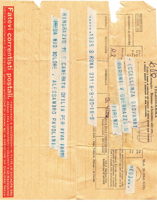 Telegramma postale allo scrittore Giovanni Papini a Firenze