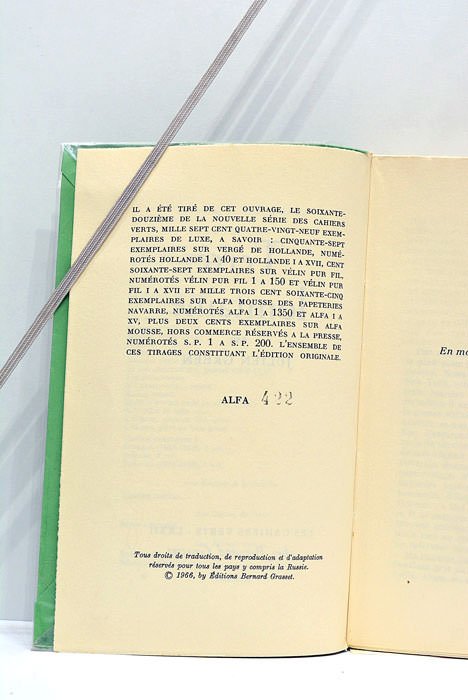 312 pages. (18,5x12cm.). Broché. Couverture imprimée. Nº 422 des 1350 exemplaires tirés sur papier Alfa. Tres bon état. Exemplaire bien conservé.