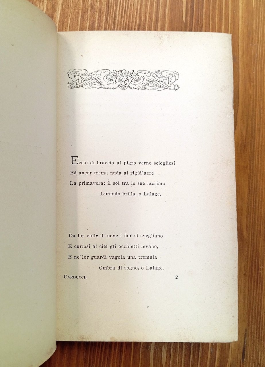 Prima edizione, stampata il 31 ottobre 1889 - Volume rilegato in copertina amatoriale decorata, titolo in oro su tassello in pelle applicato al dorso, 135 pagine. Conservati i piatti della brossura originale, con qualche ordinario segno del tempo e una menda al posteriore. Occasionali fioriture, peraltro esemplare in buono-ottimo stato di conservazione.