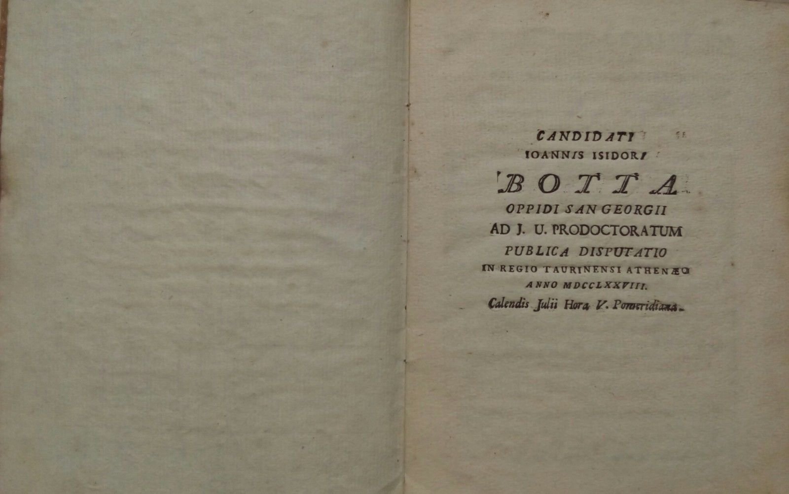 Tesi di LaureaCandidato Botta di San Giorgio Canavese TOin Regio Taurinensi Atheneopagine 16stampato ex Typographia Masserano in via Eridani Taurini MDCCLXXVIIIlegatura in semplice cartoncinoin buono stato 23091/U