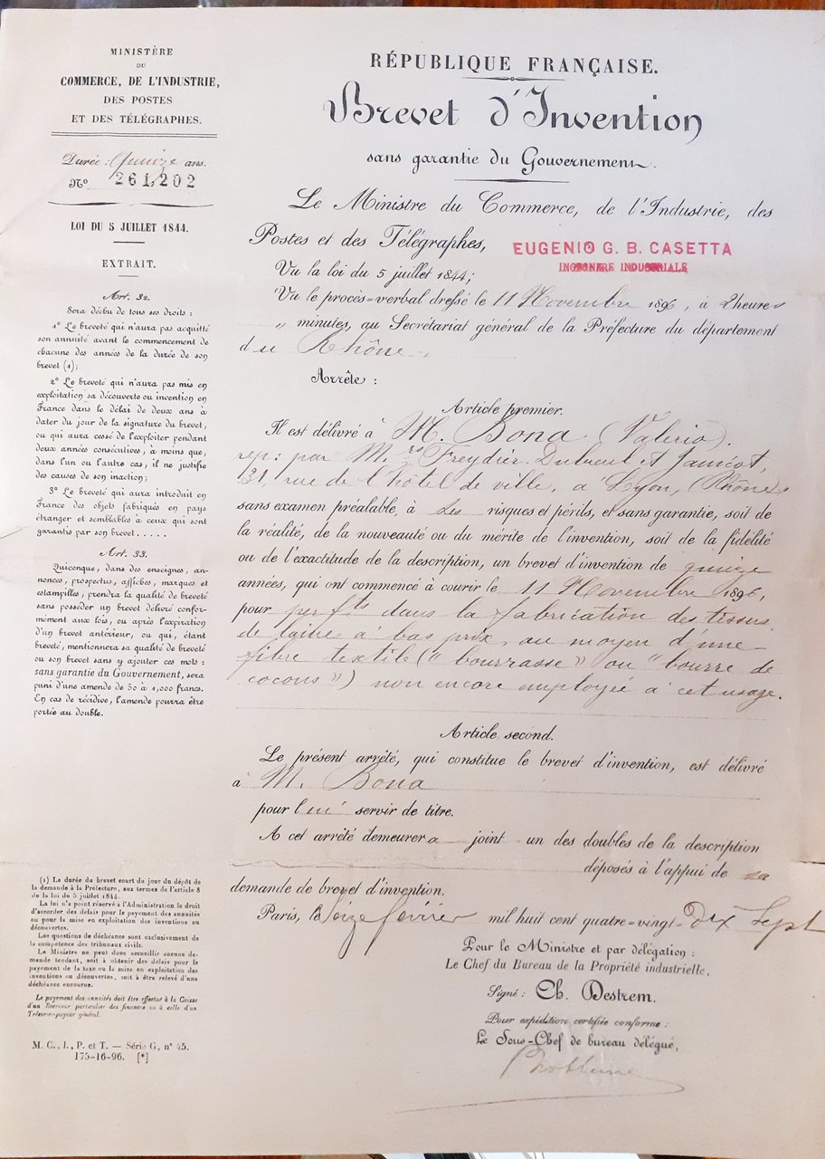 Tessitura Bona Carignano - Brevetto nuovo tessuto per Republique Francaise 1896