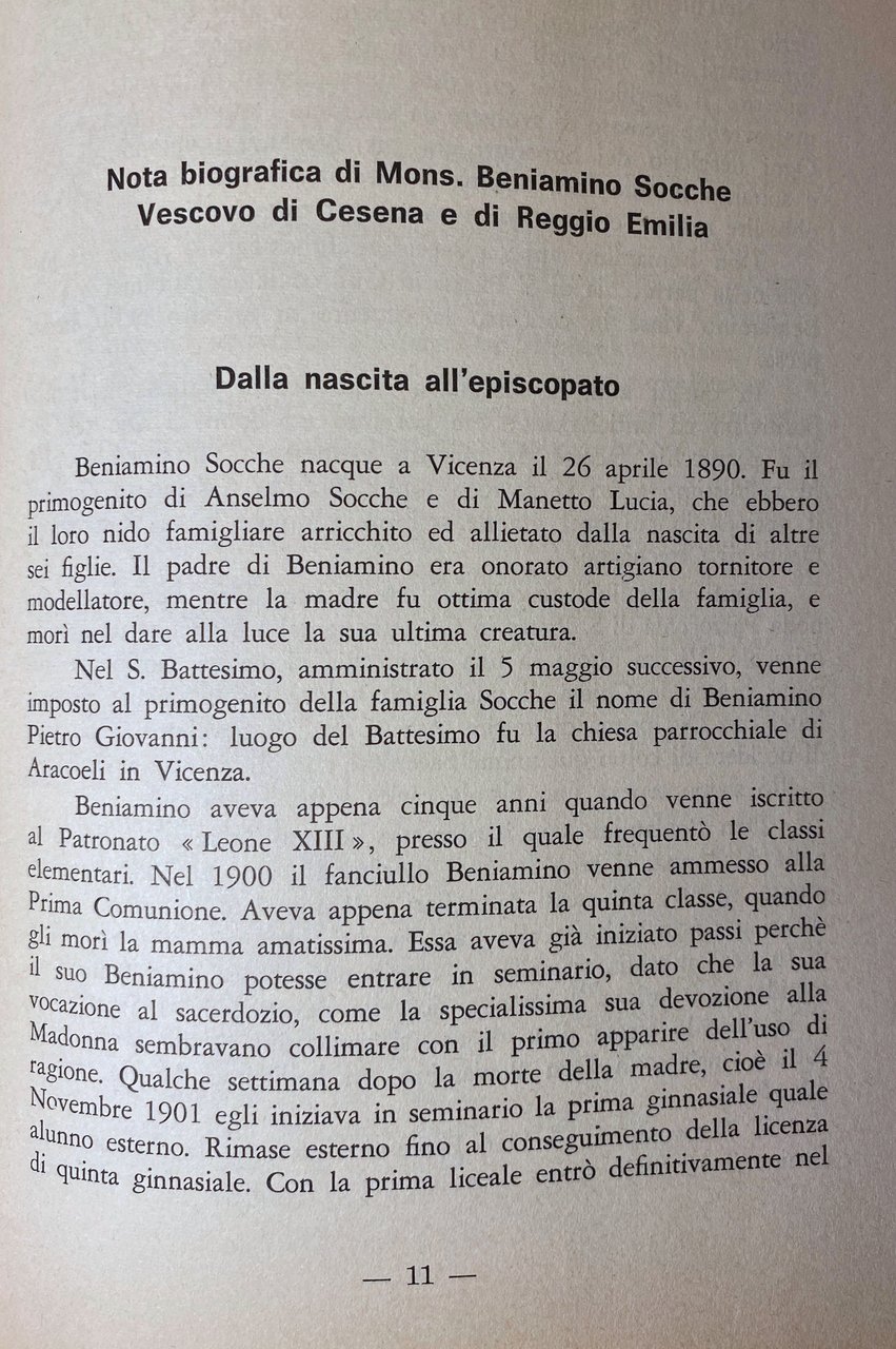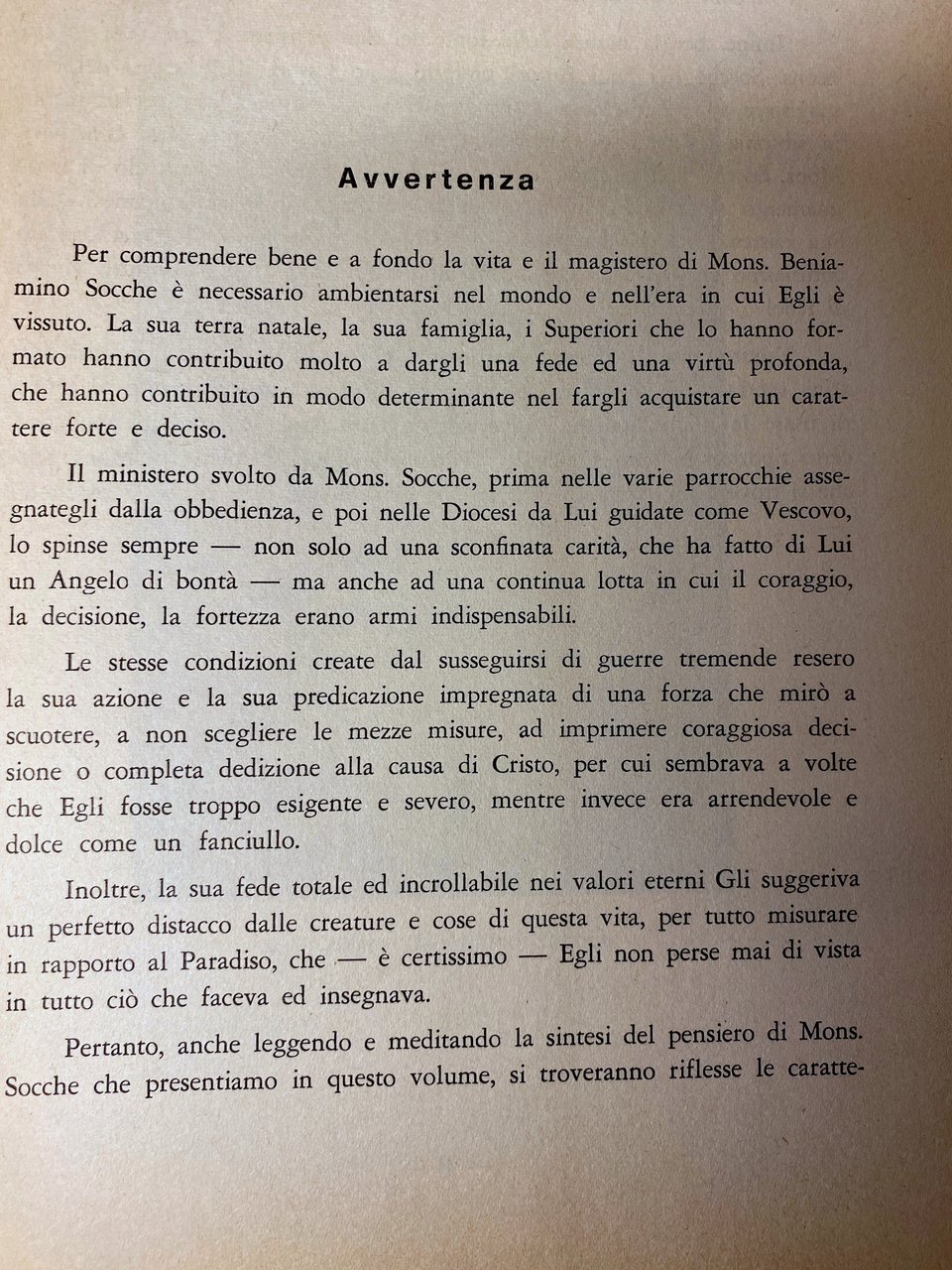 Per comprendere bene e a fondo la vita e il magistero di Mons. Beniamino Socche è necessario ambientarsi nel mondo e nell'era in cui Egli è vissuto. La sua terra natale, la sua famiglia, i Superiori che lo hanno formato hanno contribuito molto a dargli una fede ed una virtù profonda, che hanno contribuito in modo determinante nel fargli acquistare un carattere forte e deciso. Il ministero svolto da Mons. Socche, prima nelle varie parrocchie assegnategli dalla obbedienza, e poi nelle Diocesi da Lui guidate come Vescovo, lo spinse sempre non solo ad una sconfinata carità, che ha fatto di Lui un Angelo di bontà ma anche ad una continua lotta in cui il coraggio, la decisione, la fortezza erano armi indispensabili. Le stesse condizioni create dal susseguirsi di guerre tremende resero la sua azione e la sua predicazione impregnata di una forza che mirò a scuotere, a non scegliere le mezze misure, ad imprimere coraggiosa decisione o completa dedizione alla causa di Cristo, per cui sembrava a volte che Egli fosse troppo esigente e severo, mentre invece era arrendevole e dolce come un fanciullo. Inoltre, la sua fede totale ed incrollabile nei valori eterni Gli suggeriva un perfetto distacco dalle creature e cose di questa vita, per tutto misurare è certissimo Egli non perse mai di vista in rapporto al Paradiso, che in tutto ciò che faceva ed insegnava. Pertanto, anche leggendo e meditando la sintesi del pensiero di Mons. Socche che presentiamo in questo volume, si troveranno riflesse le caratteristiche della sua vita, non facile, non mediocre, ma dura, eroica e piena di severità, che Egli mai rifiutò per amore di Dio, di Cristo, della Chiesa e della Madonna che furono sempre i suoi grandi tesori. Infine, per la natura delle fonti del Suo pensiero, e per l'era in cui Mons. Socche e i Suoi Autori preferiti sono vissuti, dagli scritti del Suo magistero appare un modo di esporre la verità cattolica non perfettamente in sintonia coi modi di esposizione di questi nostri tempi post conciliari. Mons. Socche non ha fatto in tempo ad aggiornare il Suo metodo di insegnamento secondo lo spirito moderno, anche se negli ultimi mesi della Sua esistenza terrena ha parlato del Concilio e della sua dottrina con un entusiasmo ed una fede che pochi altri hanno avuto: Egli, infatti, viveva di fede! Tenuto conto di questi avvertimenti, si troverà in questo libro una dottrina espressa nel modo antico, un poco sorpassata anche quanto al modo di usare la lingua italiana: i periodi, le traduzioni, le citazioni non sono certo riportati in tono aggiornato. Tuttavia nell'insegnamento di Mons. Socche si troverà una sostanza di bene che gioverà non poco a chi la mediterà.