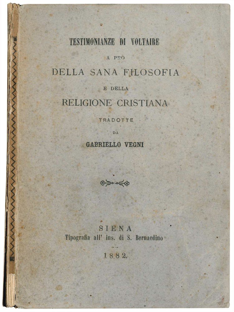 Testimonianze di Voltaire a pro della sana filosofia e della religione cristiana tradotte da Gabriello Vegni.
