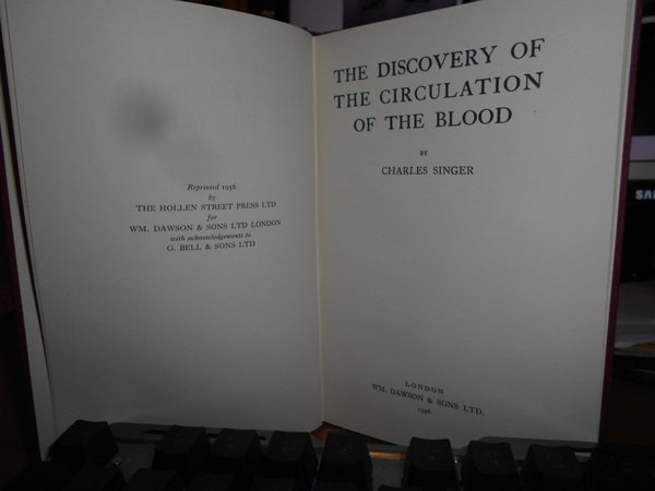by CHARLES SINGER. London, W.M. Dawson & Son LTD., 1956. The Discovery of the Circulation of the Blood. In-16°, tela bordeaux con titolo in oro al dorso. X, 80 pp. con VIII tavole fuori testo. Come nuovo. Uff. F - 4