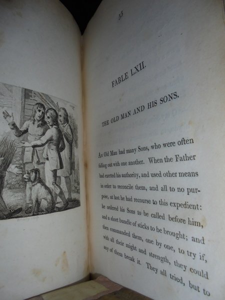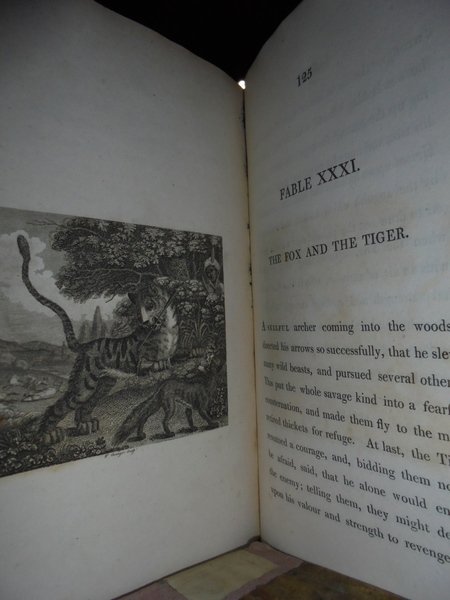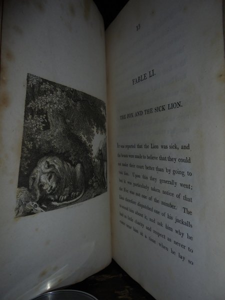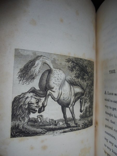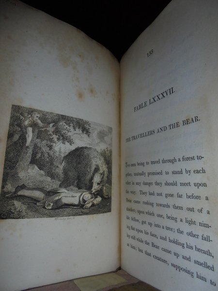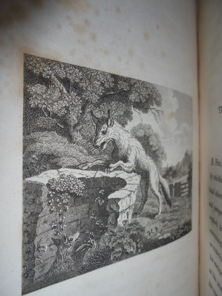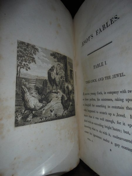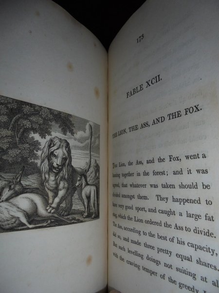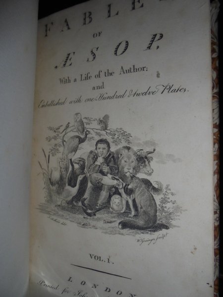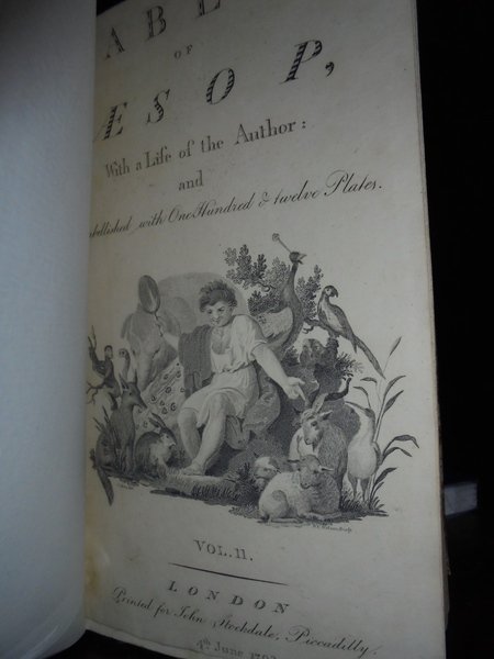 AESOPUS. The Fables of Aesop, With a Life of the Author; and Embellished with one Hundred & twelve Plates. London, Printed of John Stockdale, 1793. Due volumi in - 8°grande, piena pelle, dorso a nervi decorato in oro. I: lcv, (1), 189, (1) pp., frontespizio con vignetta allegorica e 47 tavole incise in rame f.t. II: xi, (1), 248 pp. frontespizio inciso c.s. e tavole 48 a 110 incise in rame f.t. Bell' esemplare con lievissime rifioriture qua e là, quasi impercettibili. Pregevole edizione inglese delle Favole di Esopo illustrate a all' acquaforte da Thomas Stohard (Londra. 1755 - 1834). Brunet, I, 103. Lowndes, I, 17.