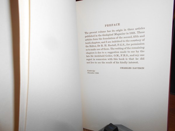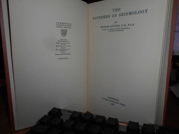 by CHARLES DAVISON. Cambridge, at The University Press, 1927. THE FOUNDERS OF SEISMOLOGY. In-8°, tela con titolo in oro al dorso. x, 240 pp. con 11 illustrazioni nel testo. Ottimo esemplare. Uff. C - II - 7