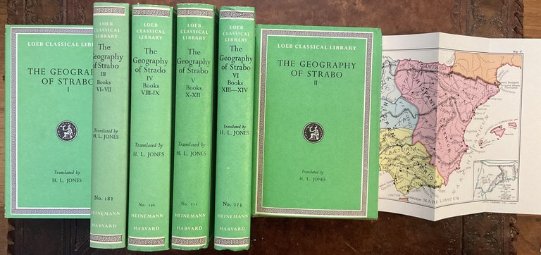XIV Books in six volumes (of eight). With an english translation by H. L. Jones. Very good, green cloth, titles in gold on spines, gilt decorations on front covers, green paper dust jacket, xliv+531 pgs, viii+480 pgs, v+397 pgs, viii+465 pgs, viii+542 pgs, viii+397 pgs. Coloured Maps. Text is in English and Greek
