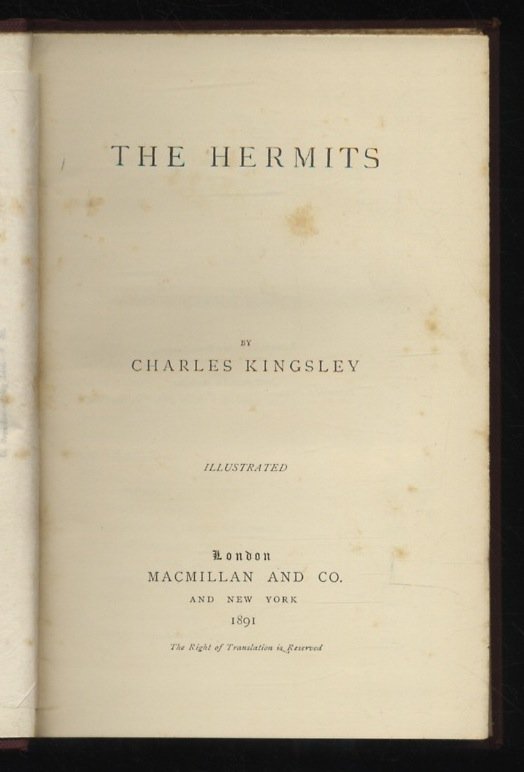 London, MacMillan and Co., 1891, in-8 piccolo, tela editoriale, titolo in oro al dorso, iniziali dell'autore sul piatto anteriore, pp. [6], 335, [3]. Con antiporta e 2 illustrazioni su tavole f.t. Interessante studio sugli eremiti. Ottime condizioni. Ex-libris Dorothy Schlensinger.
