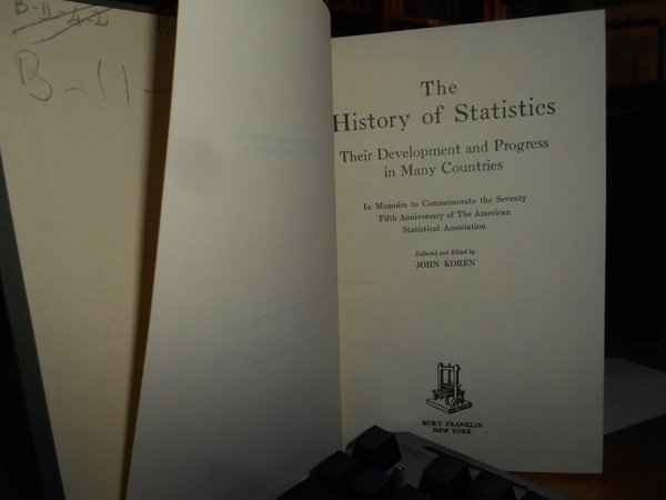 John Koren. New York, Burt Franklin, 1970. The History of Statistics, Their Development and Progress in Many Countries: In Memoirs to Commemorate the Seventy-Fifth Anniversary of the American Statistical Association. In-8°, tela verde edit. con titolo in oro al dorso. xii, 773 pp. Come nuovo. Uff. B - II - 2