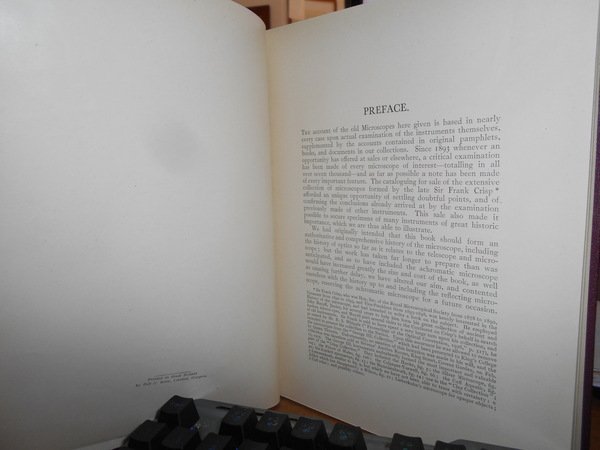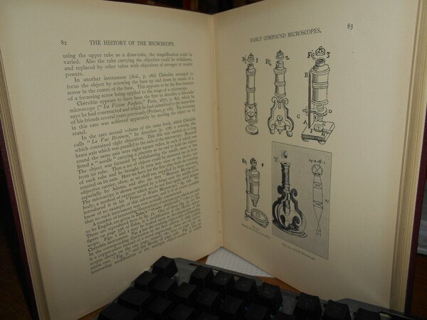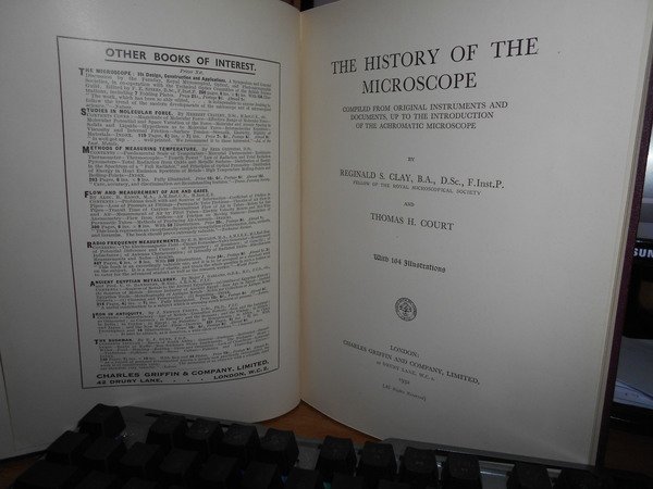 REGINALD S. CLAY. London, Charles Griffin and Company, 1932. The History of the Microscope compiled from original instruments and documents up to the introduction of the achromatic microscope. In-8°, tela edit. bordeaux con titolo in oro al dorso. xiv, 266 pp. con numerose illustrazioni n.t. Ottimo esemplare. Uff. C - III - 3